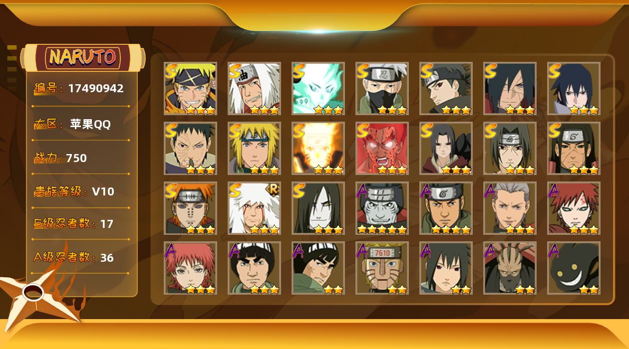 【S级忍者】:千手柱间「秽土转生」(3星),宇智波鼬「秽土转生」(3星),宇智波斑「秽土转生·解」(3星),宇智波带土「忍界大战」(3星),宇智波鼬「须佐能乎」(3星),宇智波止水「须佐能乎」(3星),旗木卡卡西「须佐能乎」(3星),自来也「舞之豪杰」(3星),大蛇丸(3星),自来也「传说中的三忍」(3星),波风水门(3星),漩涡鸣人「九喇嘛连结」(3星),迈特凯「死门」(3星),佩恩「天道」(3星),宇智波佐助「永恒万花筒」(3星),大筒木舍人「最终章」(3星),漩涡鸣人·宇智波佐助(3星)
