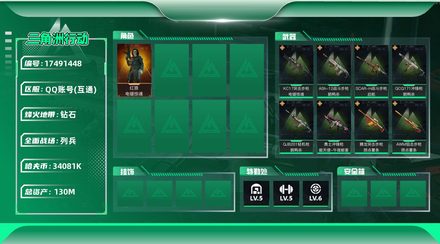 [17491448]【店主推荐捡漏号!可直接换绑】34081k哈伏币-119m流动资产-60烽火等级-钻石-7战场等级-列兵 【干员外观】:红狼-电锯惊魂 【近战皮肤】:近战-黑鹰 【传说外观】:M4A1突击步枪-阿米娅,ASh-12战斗步枪-鹅鸭杀,AK-12突击步枪-特斯拉线圈,SCAR-H战斗步枪-启航,CAR-15突击步枪-阿米娅,腾龙突击步枪-捞点薯条,KC17突击步枪-电锯惊魂,UZI冲锋枪-特斯拉线圈,SR-3M紧凑突击步枪-特斯拉线圈,勇士冲锋枪-能天使-午夜邮差,QCQ171冲锋枪-鹅鸭杀,QJB201轻机枪-鹅鸭杀,AWM狙击步枪-捞点薯条,93R-捞点薯条,复合弓-黑·天际线 【史诗外观】:M16A4突击步枪-竞赛选手,AUG突击步枪-蝮蛇,SCAR-H战斗步枪-囚徒,MP5冲锋枪-深海恐惧,MP5冲锋枪-战术竞备,MP5冲锋枪-竞技风,SR-3M紧凑突击步枪-战术竞备,勇士冲锋枪-工业狂潮,M250通用机枪-囚徒,SVD狙击步枪-阿萨拉工艺,SV-98狙击步枪-林中猎手,SV-98狙击步枪-囚徒,SV-98狙击步枪-猎鳄行动 【稀有外观】:AKM突击步枪-肃杀,QBZ95-1突击步枪-公平竞技,M7战斗步枪-捣蛋鬼,SCAR-H战斗步枪-荣耀列队,腾龙突击步枪-冰天雪地,MP5冲锋枪-弄臣,MP5冲锋枪-虎啸,MP5冲锋枪-哈夫克卫队,P90冲锋枪-黄昏,Vector冲锋枪-先锋,UZI冲锋枪-亚特兰蒂斯,SMG-45-行动开启,SMG-45冲锋枪-幻影结构,SMG-45冲锋枪-天网,QJB201轻机枪-哈夫克卫队,Mini-14射手步枪-荣耀列队,SKS射手步枪-弄臣,SR-25射手步枪-开拓,SR-9射手步枪-街头涂鸦,SV-98狙击步枪-星链科技,SV-98狙击步枪-哈夫克航天,SV-98狙击步枪-精英联盟,G18-星链科技,G18-哈夫克航天 【普通外观】:M4A1突击步枪-粉色涂装,M4A1突击步枪-高雅黑,M4A1突击步枪-海色,QBZ95-1突击步枪-高雅黑,QBZ95-1突击步枪-海浪,QBZ95-1突击步枪-海色,QBZ191突击步枪-三角洲力量,K416突击步枪-几何迷彩,K416突击步枪-高雅黑,M16A4突击步枪-山林猎人,M16A4突击步枪-高雅黑,AUG突击步枪-浅蓝涂装,M7战斗步枪-红色涂装,SG552突击步枪-浅蓝涂装,SG