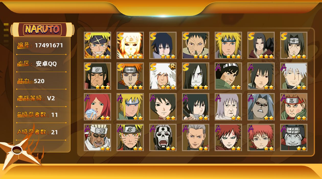 - [11657998]V7 5S忍 14A忍 11通灵 244.6W战力 可二次 优质装备:宇智波斑「秽土转生·解」,漩涡鸣人 「暴怒·第六尾」 S级忍者:自来也 「舞之豪杰」,宇智波鼬 「须佐能乎」,佩恩「天道」1