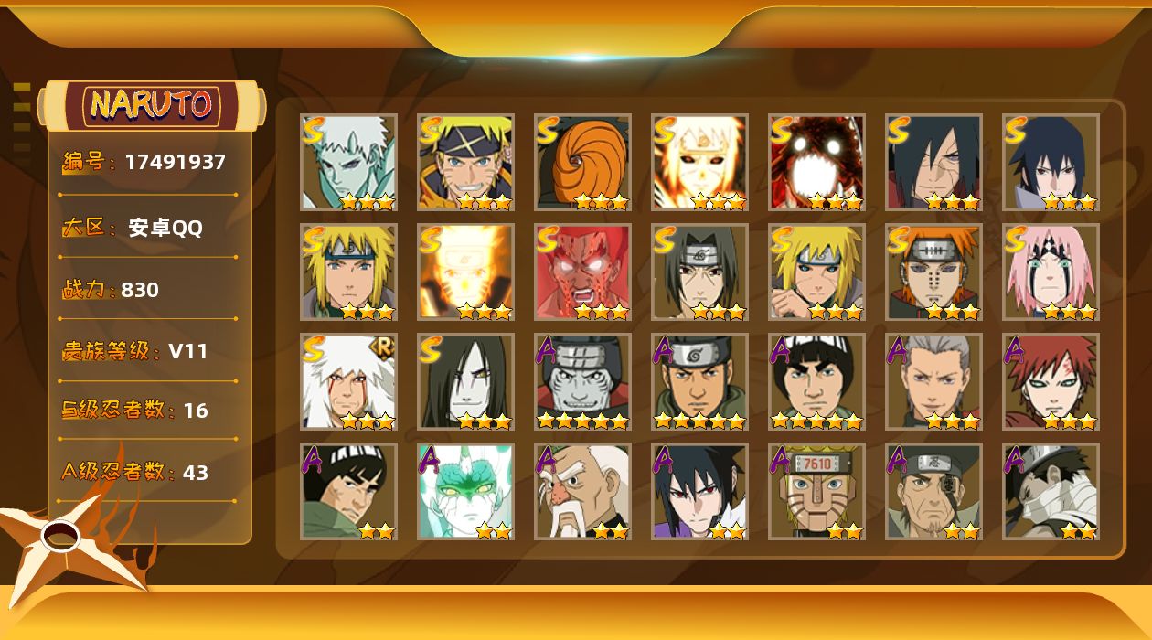 [17491937]16S级忍者数-43A级忍者数 【S级忍者】:波风水门「秽土转生」(3星),宇智波斑「秽土转生·解」(3星),春野樱「忍界大战」(3星),宇智波鼬「须佐能乎」(3星),自来也「舞之豪杰」(3星),大蛇丸(3星),波风水门(3星),漩涡鸣人「九喇嘛连结」(3星),迈特凯「死门」(3星),佩恩「天道」(3星),宇智波佐助「永恒万花筒」(3星),漩涡鸣人「暴怒·第六尾」(3星),波风水门「九喇嘛连结」(3星),宇智波斑「五影会谈」(3星),漩涡鸣人·宇智波佐助(3星),宇智波带土「十尾人柱力」(3星) 【A级忍者】:艾「青年」(2星),长门「青年」(2星),达鲁伊「博人传」(2星),迪达拉「秽土转生」(2星),大蛇丸「晓」(2星),大蛇丸「新春限定」(2星),飞段(3星),飞段「死司凭血」(2星),干柿鬼鲛(5星),漩涡博人「桃式显现」(2星),机械鸣人「初始形态」(2星),迈特凯(5星),旗木卡卡西「元气夏日」(2星),旗木卡卡西「幻之真容」(2星),桃地再不斩(2星),桃地再不斩「秽土转生」(2星),我爱罗「疾风传」(3星),我爱罗「忍界大战」(2星),蝎(2星),小南「神驹佑将」(2星),猿飞阿斯玛(5星),宇智波鼬(2星),宇智波鼬「新春限定」(2星),宇智波鼬「夏日限定」(2星),宇智波佐助「疾风传咒印」(2星),宇智波佐助「万花筒写轮眼」(2星),宇智波佐助「侠隐江湖」(2星),药师兜「半蛇斗篷」(2星),照美冥「五代目水影」(2星),日向宁次「忍界大战」(2星),长十郎「六代目水影」(2星),神秘面具男「忍者之路」(2星),佩恩·六道「漂泊浪客」(2星),李洛克「忍界大战」(2星),秋道丁次「忍界大战」(2星),千代「近松十人卫」(2星),神农「羁绊」(2星),土台「忍界大战」(2星),宇智波泉奈(2星),不动(2星),大野木「侠隐江湖」(2星),巳月「仙人模式」(2星),迈特凯「青春爆炸」(2星)
