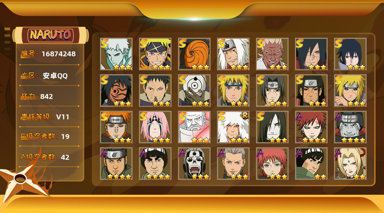[16874248]19S级忍者数-42A级忍者数 【S级忍者】:波风水门「秽土转生」(3星),千手柱间「秽土转生」(3星),宇智波斑「秽土转生·解」(3星),春野樱「忍界大战」(3星),宇智波带土「忍界大战」(3星),艾「忍界大战」(3星),宇智波鼬「须佐能乎」(3星),自来也「舞之豪杰」(3星),大蛇丸(3星),自来也「传说中的三忍」(3星),波风水门(3星),神秘面具男「红夜之刃」(3星),佩恩「天道」(3星),宇智波佐助「永恒万花筒」(3星),宇智波斑 「白面具」(3星宇智波斑「白面具」),大筒木金式(3星),宇智波斑「五影会谈」(3星),漩涡鸣人·宇智波佐助(3星),宇智波带土「十尾人柱力」(3星) 【A级忍者】:长门「青年」(2星),波风水门「青年」(2星),迪达拉「秽土转生」(2星),大蛇丸「晓」(2星),奇拉比(2星),飞段(3星),飞段「死司凭血」(3星),干柿鬼鲛(4星),漩涡博人「桃式显现」(2星),机械鸣人「初始形态」(2星),迈特凯(4星),旗木卡卡西「元气夏日」(2星),旗木卡卡西「万花筒写轮眼」(2星),桃地再不斩「漂泊武士」(2星),桃地再不斩「秽土转生」(2星),我爱罗「疾风传」(4星),蝎(3星),蝎「绯流琥」(2星),小南「漂泊浪客」(2星),猿飞阿斯玛(4星),宇智波佐助「须佐能乎」(2星),药师兜「半蛇斗篷」(2星),药师兜「侠隐江湖」(2星),日向宁次「忍界大战」(2星),日向雏田「最终章」(2星),长十郎「六代目水影」(2星),纲手「侠隐江湖」(2星),神秘面具男「忍者之路」(2星),佩恩·六道「漂泊浪客」(2星),李洛克「忍界大战」(2星),猿飞木叶丸「博人传」(2星),黑土「博人传」(2星),千手扉间「漂泊武士」(2星),秋道丁次「忍界大战」(2星),千代「近松十人卫」(2星),土台「忍界大战」(2星),不缘(2星),宇智波泉奈(2星),大野木「侠隐江湖」(2星),巳月「仙人模式」(2星),纲手「妖怪奇谭」(2星),迈特凯「青春爆炸」(2星)