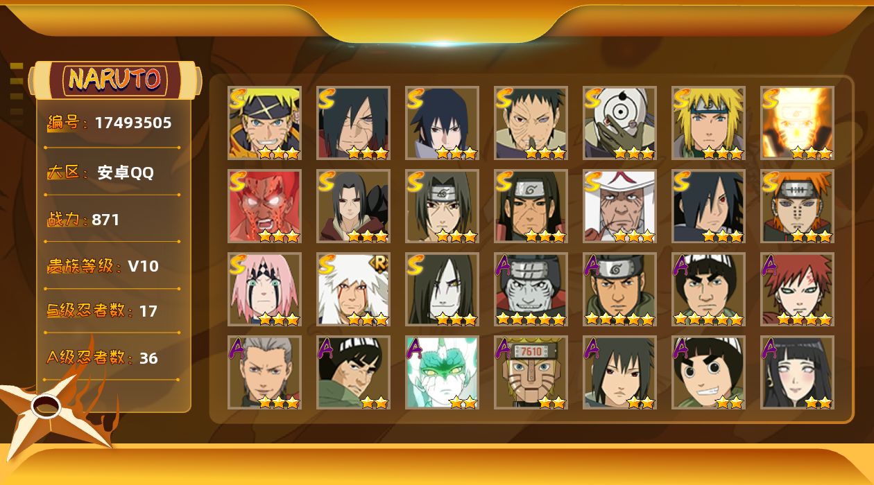 【A级忍者】:艾「青年」(2星),长门「青年」(2星),波风水门「青年」(2星),达鲁伊「博人传」(2星),迪达拉(2星),大蛇丸「晓」(2星),奇拉比「忍界大战」(2星),飞段(3星),飞段「死司凭血」(2星),干柿鬼鲛(5星),漩涡博人「桃式显现」(2星),漩涡鸣人「九尾查克拉」(2星),机械鸣人「初始形态」(2星),迈特凯(5星),我爱罗「疾风传」(4星),蝎(2星),小南「神驹佑将」(2星),猿飞阿斯玛(5星),宇智波止水「新春限定」(2星),宇智波鼬(2星),宇智波鼬「夏日限定」(2星),宇智波佐助「须佐能乎」(2星),宇智波佐助「万花筒写轮眼」(2星),照美冥「五代目水影」(2星),日向宁次「忍界大战」(2星),日向雏田「最终章」(2星),长十郎「六代目水影」(2星),李洛克「忍界大战」(2星),黑土「博人传」(2星),秋道丁次「忍界大战」(2星),千代「近松十人卫」(2星),不缘(2星),不风(2星),宇智波泉奈(2星),巳月「仙人模式」(2星),迈特凯「青春爆炸」(2星)