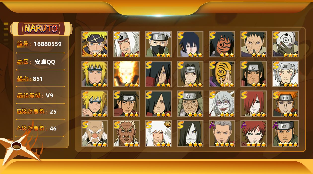 [16880559] VIP9,851W战力,S忍25个,A忍46个,金银角98片,带土59片,创立柱间80片,自来也63片,21000金币,21高招券