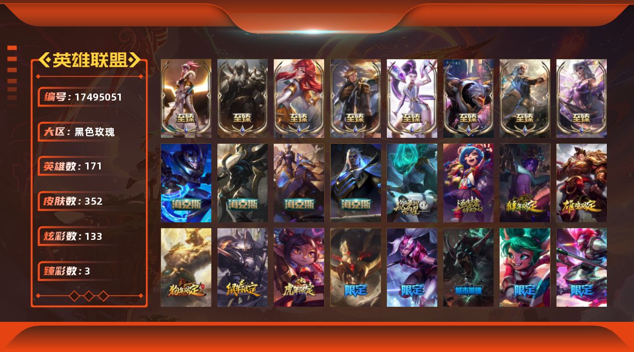 [17495051]【店主推荐捡漏号】未定级段位-171英雄-352皮肤-133炫彩-0终极-15神话-34限定-45传说-83史诗