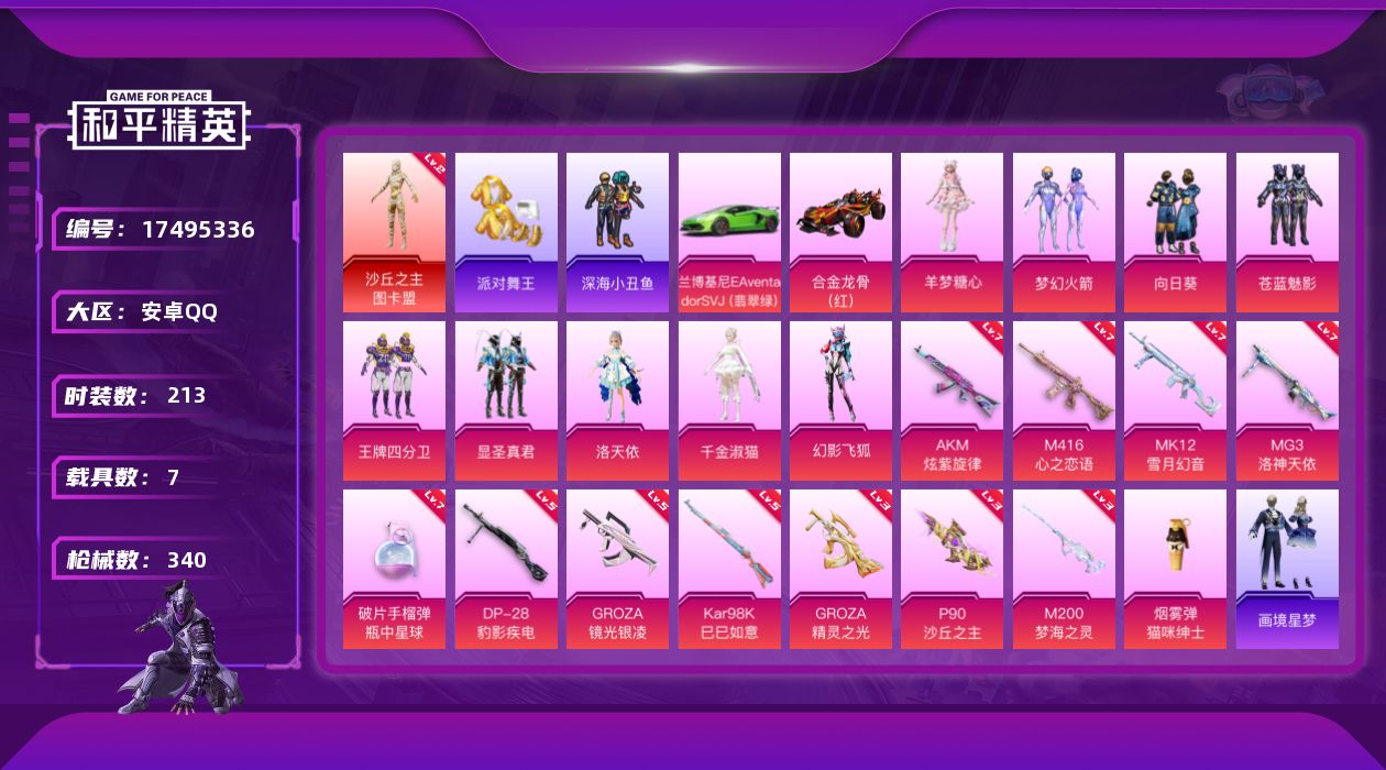 [17495336]安卓 手Q-1神装-9粉装-20特效枪-7载具-12粉色飞行器-127854热力值-11王牌印记-213套装-340枪皮【红色神装等级】:沙丘之主-图卡盟(二级)【红色角色神装】:沙丘之主-图卡盟【热门品类】:粉装-梦幻火箭,套装-派对舞王,套装-深海小丑鱼,套装-小丑鱼,角色-Mark.06,角色-六号稻草人【粉色套装】:粉装-梦幻火箭,粉装-向日葵,粉装-苍蓝魅影,粉装-王牌四分卫,粉装-显圣真君,角色-洛天依,角色-千金淑猫,粉装-幻影飞狐,角色-羊梦糖心【粉色枪皮等级】:AKM-炫紫旋律(七级),M416-心之恋语(七级),GROZA-精灵之光(三级),GROZA-镜光银凌(五级),ACE32-萌骑漫游(二级),UMP45-萌骑冒险(二级),AKS-74U-森灵之息(五级),MP7-G-水中影(三级),P90-沙丘之主(三级),Kar98K-巳巳如意(五级),Mk14-福马献瑞(五级),M200-梦海之灵(三级),MK12-雪月幻音(七级),AA12-G-萌骑幻想(一级),DP-28-豹影疾电(五级),MG3-洛神天依(七级),PKM-萌骑夺宝(一级),燃烧瓶-天降桃花(三级),破片手榴弹-瓶中星球(七级)【粉色载具】:法拉利LaFerrari(赛车红),法拉利Purosangue(赛车红),法拉利Roma(纽博格林银),法拉利Roma(赛车红),兰博基尼Aventador SVJ(翡翠绿),合金龙骨(红)【粉色枪皮】:AKM-炫紫旋律,M416-心之恋语,GROZA-精灵之光,GROZA-镜光银凌,ACE32-萌骑漫游,UMP45-萌骑冒险,AKS-74U-森灵之息,MP7-G-水中影,P90-沙丘之主,Kar98K-巳巳如意,Mk14-福马献瑞,M200-梦海之灵,MK12-雪月幻音,AA12-G-萌骑幻想,DP-28-豹影疾电,MG3-洛神天依,PKM-萌骑夺宝,烟雾弹-猫咪绅士,燃烧瓶-天降桃花,破片手榴弹-瓶中星球【粉色飞行器】:酣梦熊熊飞行器,香车宝马飞行器,炫彩糖果飞行器,春暖花开飞行器,梦幻火箭飞行器,炫紫旋律飞行器,沙丘之主天马,幻海精灵飞行器,曦光华影飞行器,凤舞九天飞行器,极意拳锋飞行器