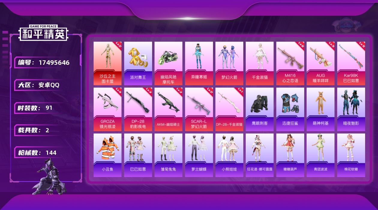 [17495646]【店主推荐捡漏号】安卓 手Q-1神装-6粉装-12特效枪-2载具-5粉色飞行器-49657热力值-6王牌印记-91套装-144枪皮【红色神装等级】:沙丘之主-图卡盟(二级)【红色角色神装】:沙丘之主-图卡盟【热门品类】:粉装-梦幻火箭,套装-派对舞王,套装-小丑鱼【粉色套装】:粉装-梦幻火箭,角色-千金淑猫,角色-异瞳寒姬,角色-月中灵,人物-小舞·雪昙,角色-虎痴许褚【粉色枪皮等级】:AKM-幽焰骑士(三级),SCAR-L-梦幻火箭(二级),M416-心之恋语(六级),GROZA-镜光银凌(四级),AUG-暖羊咩咩(五级),AUG-罪夜之冕(七级),UMP45-萌骑冒险(四级),AKS-74U-森灵之息(四级),Kar98K-巳巳如意(五级),Mk14-福马献瑞(四级),DP-28-千金淑猫(一级),DP-28-豹影疾电(三级)【粉色载具】:幽焰风驰摩托车,暮色幽蹄【粉色枪皮】:AKM-幽焰骑士,SCAR-L-梦幻火箭,M416-心之恋语,GROZA-镜光银凌,AUG-暖羊咩咩,AUG-罪夜之冕,UMP45-萌骑冒险,AKS-74U-森灵之息,Kar98K-巳巳如意,Mk14-福马献瑞,DP-28-千金淑猫,DP-28-豹影疾电