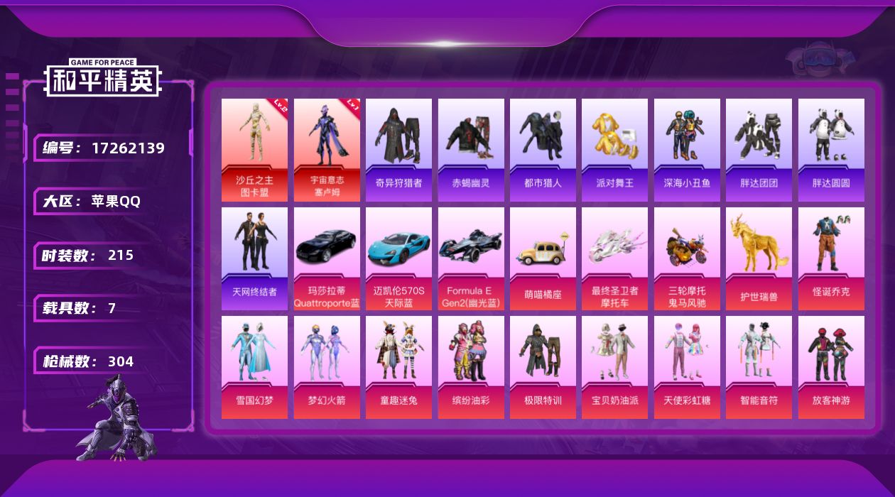 [17262139]【11123805】苹果 手Q-2神装-25粉装-22特效枪-7载具-15粉色飞行器-116910热力值-13王牌印记-215套装-304枪皮