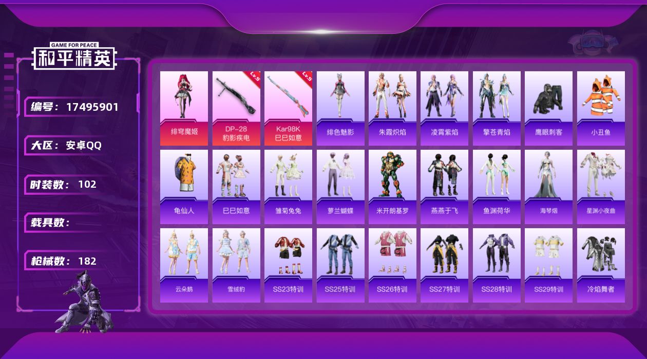 [17495901]安卓 手Q-1粉装-5特效枪-0载具-1粉色飞行器-41255热力值-3王牌印记-102套装-182枪皮【热门品类】:套装-小丑鱼,套装-龟仙人【粉色套装】:角色-绯穹魔姬【粉色枪皮等级】:AKS-74U-森灵之息(五级),Kar98K-巳巳如意(五级),Mk14-福马献瑞(三级),AA12-G-萌骑幻想(四级),DP-28-豹影疾电(五级)【粉色枪皮】:AKS-74U-森灵之息,Kar98K-巳巳如意,Mk14-福马献瑞,AA12-G-萌骑幻想,DP-28-豹影疾电【粉色飞行器】:炫彩糖果飞行器