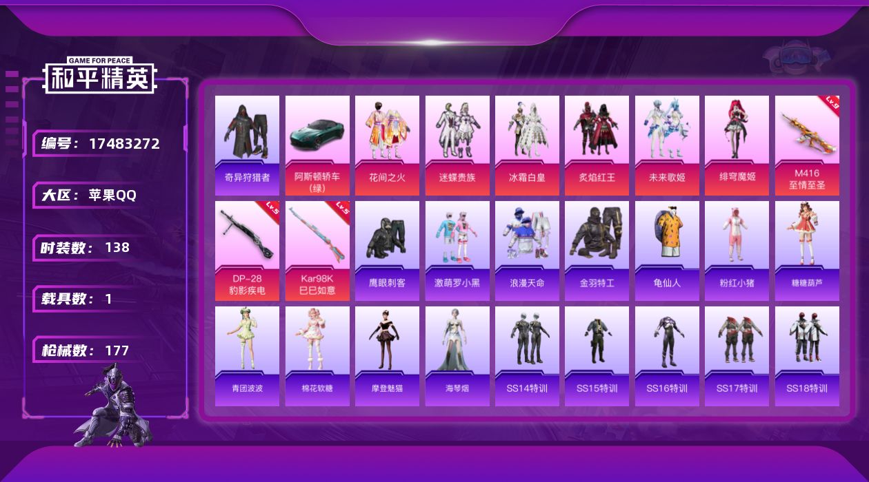 [17483272]苹果 手Q-6粉装-3特效枪-1载具-0粉色飞行器-55784热力值-6王牌印记-138套装-177枪皮