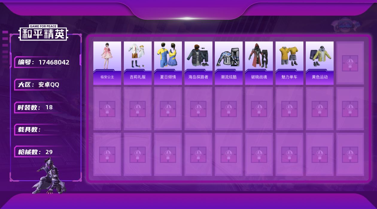 - PX_2048634- 安卓手Q-7王牌印记-有战神框-14粉装-13特效枪-7载具-108948热力值-220套装-290枪皮-0卓越印记-0传奇印记 【14粉装】,雪国幻梦,梦幻火箭,宝贝奶油派,放客神游,冷漠罗丽,凤凰座 一辉,天鹅座 冰河,智耀战神,草莓生巧,炫光之旅,宙之时溯,极限特训,绚金战神,幻影战神 【13特效枪】AKM-炫紫旋律-5级 SCAR-L-梦幻火箭-5级 M416-心之