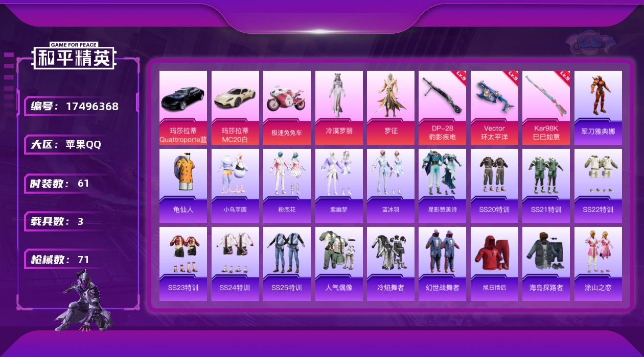 [17496368]地铁满天赋苹果 手Q-2粉装-3特效枪-3载具-1粉色飞行器-26002热力值-8王牌印记-61套装-71枪皮【热门品类】:角色-军刀雅典娜,套装-龟仙人【粉色套装】:角色-冷漠罗丽,角色-罗征【粉色枪皮等级】:Vector-环太平洋(五级),Kar98K-巳巳如意(五级),DP-28-豹影疾电(五级)【粉色载具】:玛莎拉蒂MC20(星石白),玛莎拉蒂Quattroporte(夜幕蓝),极速兔兔车【粉色枪皮】:Vector-环太平洋,Kar98K-巳巳如意,DP-28-豹影疾电