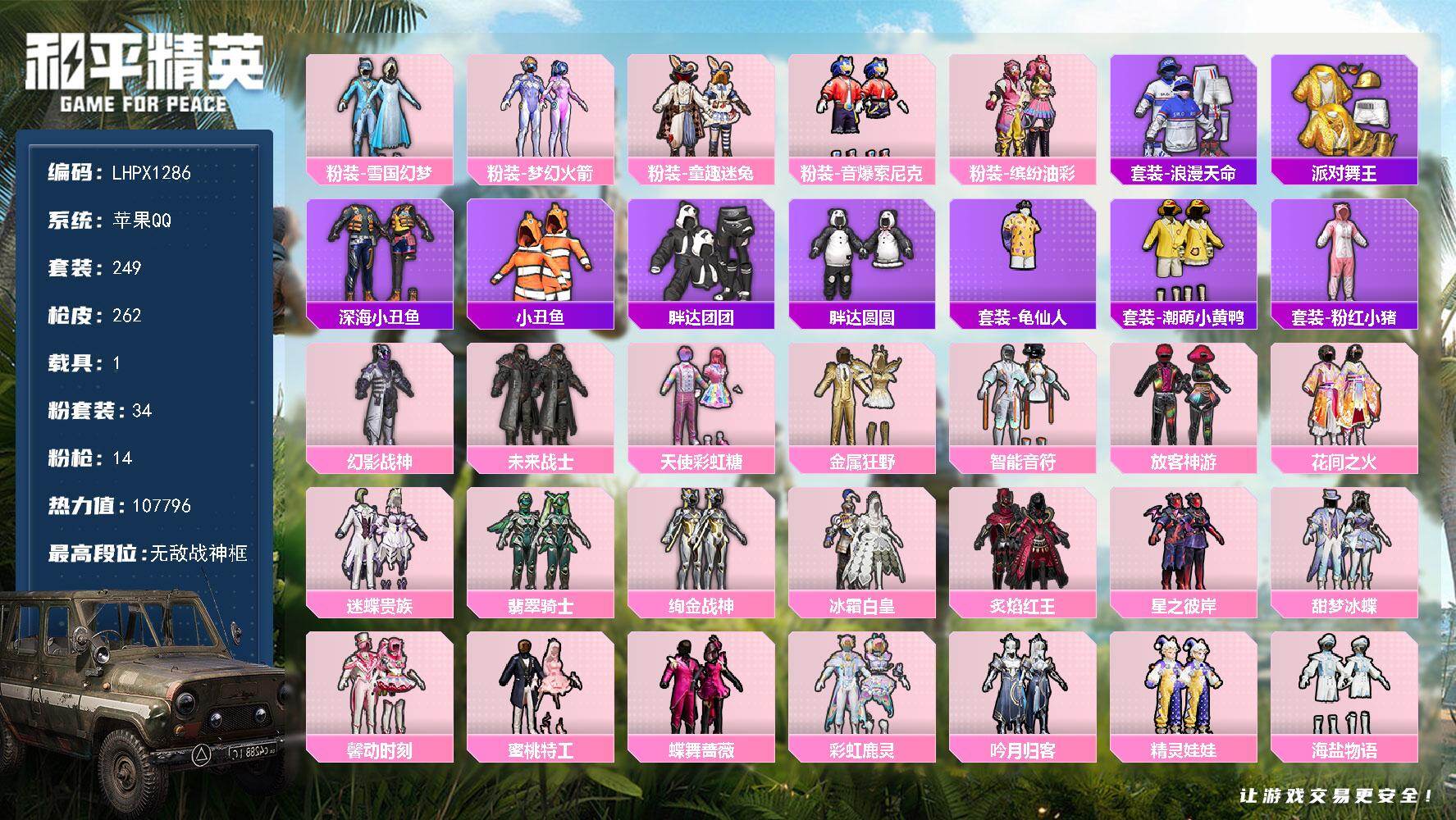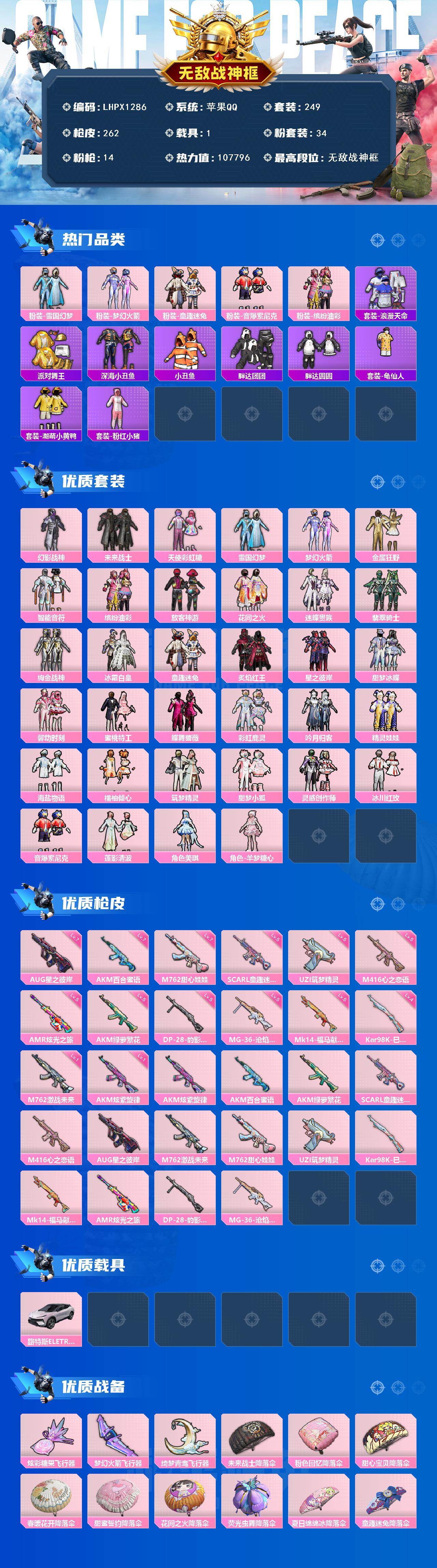 [17496469]【特价出售/店主推荐】/无敌战神框1/绝世印记2 苹果 手Q-无敌战神框-34粉装-14特效枪-1载具-3粉色飞行器-10.7w热力值-19王牌印记-249套装-262枪皮【热门品类】:粉装-雪国幻梦,粉装-梦幻火箭,粉装-童趣迷兔,粉装-音爆索尼克,粉装-缤纷油彩,套装-浪漫天命,套装-派对舞王,套装-深海小丑鱼,套装-小丑鱼,套装-胖达团团,套装-胖达圆圆,套装-龟仙人,套装-潮萌小黄鸭,套装-粉红小猪【粉色套装】:粉装-幻影战神,粉装-未来战士,粉装-天使彩虹糖,粉装-雪国幻梦,粉装-梦幻火箭,粉装-金属狂野,粉装-智能音符,粉装-缤纷油彩,粉装-放客神游,粉装-花间之火,粉装-迷蝶贵族,粉装-翡翠骑士,粉装-绚金战神,粉装-冰霜白皇,粉装-童趣迷兔,粉装-炙焰红王,粉装-星之彼岸,粉装-甜梦冰蝶,粉装-馨动时刻,粉装-蜜桃特工,粉装-蝶舞蔷薇,粉装-彩虹鹿灵,粉装-吟月归客,粉装-精灵娃娃,粉装-海盐物语,粉装-橘柚倾心,粉装-筑梦精灵,粉装-甜梦小狐,粉装-灵感创作师,粉装-冰川红玫,粉装-音爆索尼克,粉装-莲影清波,角色-美琪,角色-羊梦糖心【粉色枪皮等级】:AKM-炫紫旋律(一级),AKM-百合蜜语(七级),AKM-绿萝繁花(五级),SCAR-L-童趣迷兔(五级),M416-心之恋语(五级),AUG-星之彼岸(七级),M762-激战未来(一级),M762-甜心娃娃(七级),UZI-筑梦精灵(五级),Kar98K-巳巳如意(四级),Mk14-福马献瑞(五级),AMR-炫光之旅(五级),DP-28-豹影疾电(五级),MG-36-沧焰双生(五级)【粉色载具】:路特斯ELETRE(花绽灰)【粉色飞行器】:炫彩糖果飞行器,梦幻火箭飞行器,绮梦青鸾飞行器