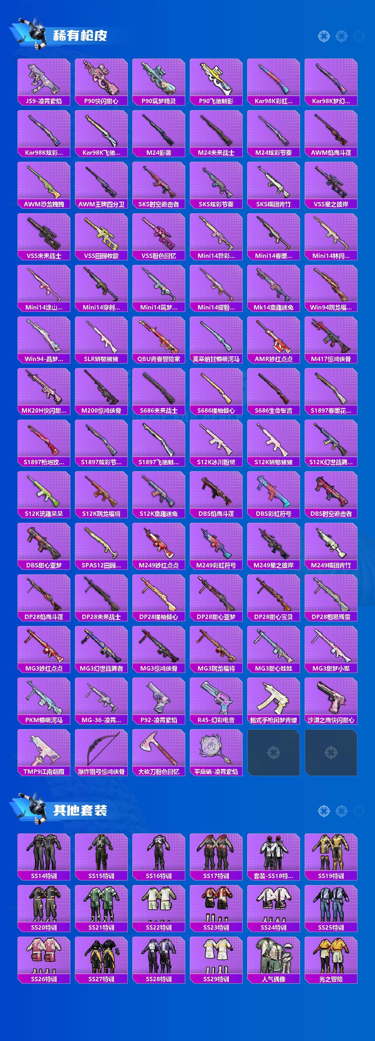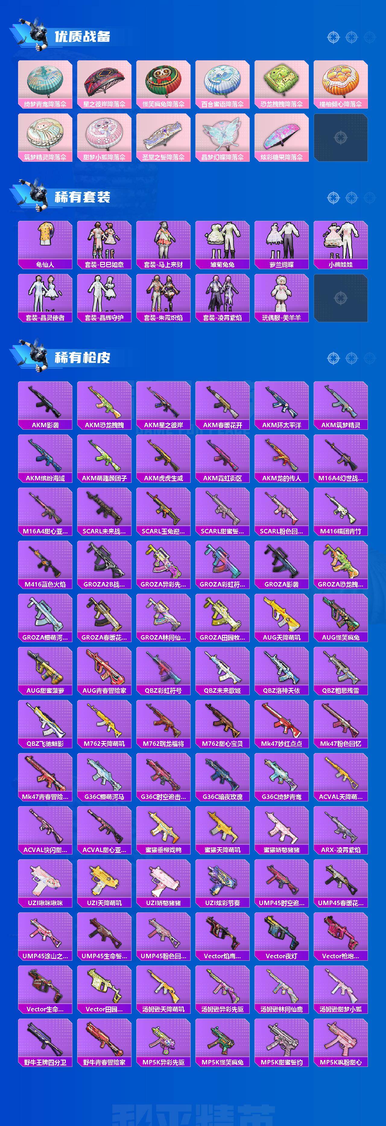 AKM-炫紫旋律,AKM-绿萝繁花,SCAR-L-童趣迷兔,M416-心之恋语,AUG-星之彼岸,M762-激战未来,M762-甜心娃娃,UZI-筑梦精灵,Kar98K-巳巳如意,AMR-炫光之旅