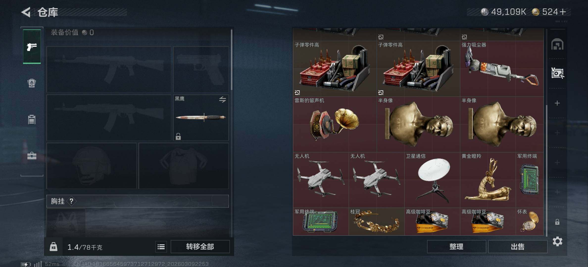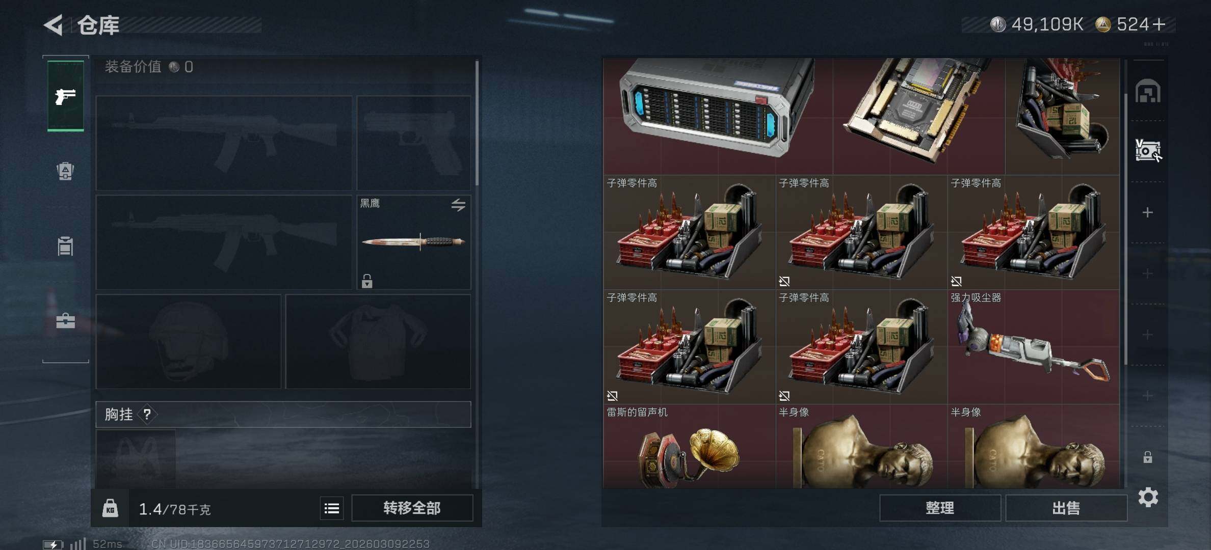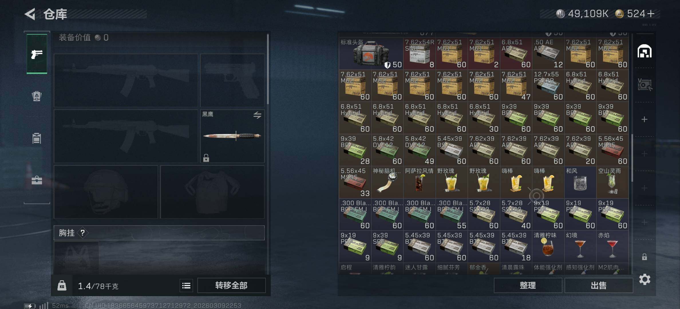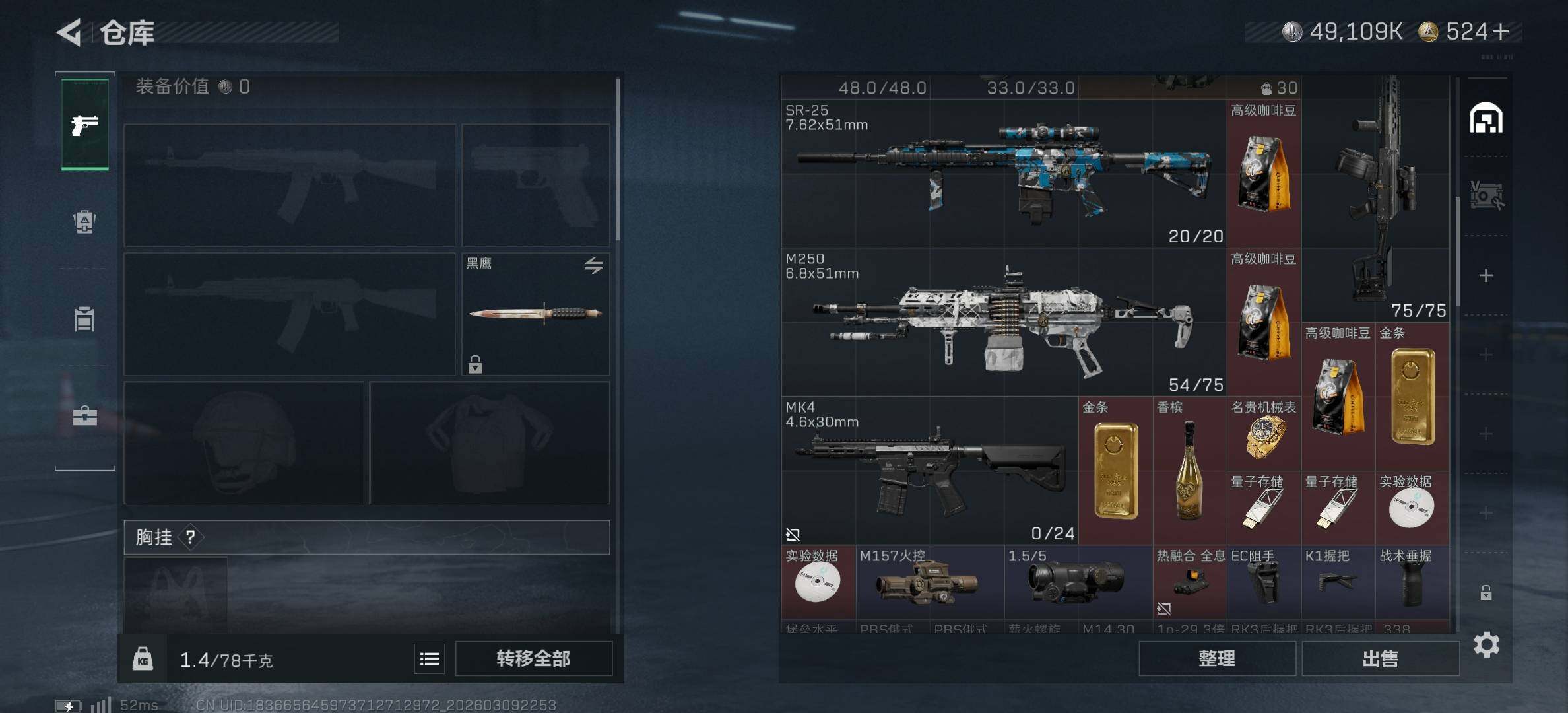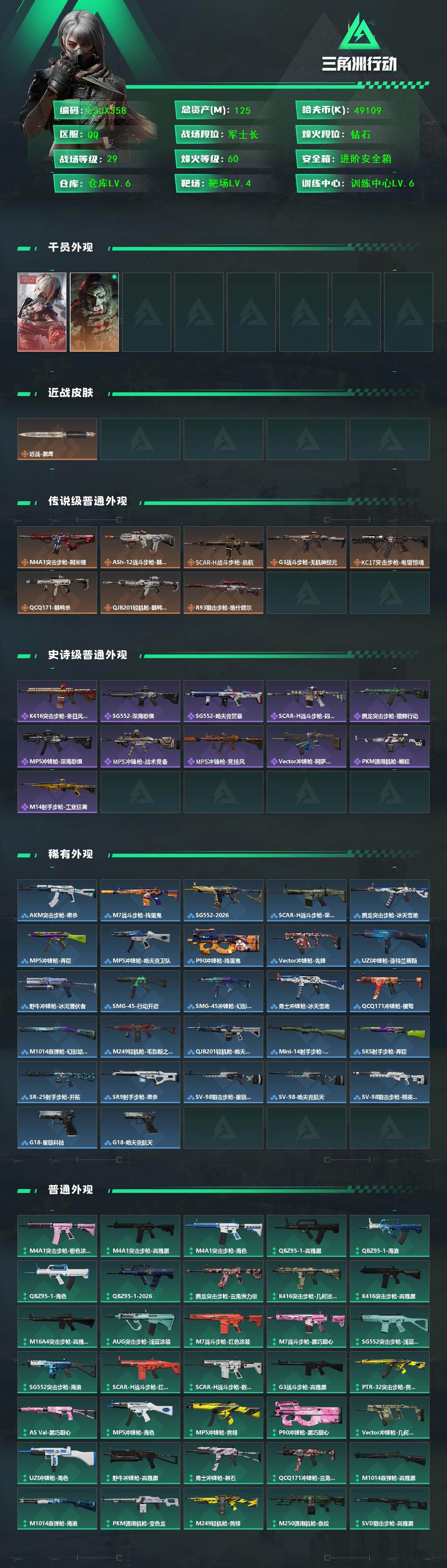 [17496955]125m总资产-49109k哈伏币-60烽火等级-钻石-29战场等级-军士长 【干员外观】:骇爪-维什戴尔,红狼-电锯惊魂 【近战皮肤】:近战-黑鹰 【传说外观】:M4A1突击步枪-阿米娅,ASh-12战斗步枪-鹅鸭杀,SCAR-H战斗步枪-启航,G3战斗步枪-无机神经元,KC17突击步枪-电锯惊魂,QCQ171冲锋枪-鹅鸭杀,QJB201轻机枪-鹅鸭杀,R93狙击步枪-维什戴尔 【史诗外观】:K416突击步枪-冬日风情,SG552突击步枪-深海恐惧,SG552突击步枪-哈夫克警备,SCAR-H战斗步枪-囚徒,腾龙突击步枪-猎鳄行动,MP5冲锋枪-深海恐惧,MP5冲锋枪-战术竞备,MP5冲锋枪-竞技风,Vector冲锋枪-阿萨拉文明,PKM通用机枪-蝮蛇,M14射手步枪-工业狂潮 【稀有外观】:AKM突击步枪-肃杀,M7战斗步枪-捣蛋鬼,SG552突击步枪-2026,SCAR-H战斗步枪-荣耀列队,腾龙突击步枪-冰天雪地,MP5冲锋枪-弄臣,MP5冲锋枪-哈夫克卫队,P90冲锋枪-捣蛋鬼,Vector冲锋枪-先锋,UZI冲锋枪-亚特兰蒂斯,野牛冲锋枪-冰河潜伏者,SMG-45冲锋枪-行动开启,SMG-45冲锋枪-幻影结构,勇士冲锋枪-冰天雪地,QCQ171冲锋枪-银鹭,M1014霰弹枪-幻影结构,M249轻机枪-毛鲁斯之力,QJB201轻机枪-哈夫克卫队,Mini-14射手步枪-荣耀列队,SKS射手步枪-弄臣,SR-25射手步枪-开拓,SR9射手步枪-肃杀,SV-98狙击步枪-星链科技,SV-98狙击步枪-哈夫克航天,SV-98狙击步枪-精英联盟,G18-星链科技,G18-哈夫克航天 【普通外观】:M4A1突击步枪-粉色涂装,M4A1突击步枪-高雅黑,M4A1突击步枪-海色,QBZ95-1突击步枪-高雅黑,QBZ95-1突击步枪-海浪,QBZ95-1突击步枪-海色,QBZ95-1突击步枪-2026,腾龙突击步枪-三角洲力量,K416突击步枪-几何迷彩,K416突击步枪-高雅黑,M16A4突击步枪-高雅黑,AUG突击步枪-浅蓝涂装,M7战斗步枪-红色涂装,M7战斗步枪-黑巧甜心,SG552突击步枪-浅蓝涂装,SG552突击步枪-海浪,SCAR-H战斗步枪-红色涂装,SCAR-H战斗步枪-数码迷彩,G3战斗步枪-高雅黑,PTR-32突击步枪-黄蜂,AS Val突击步枪