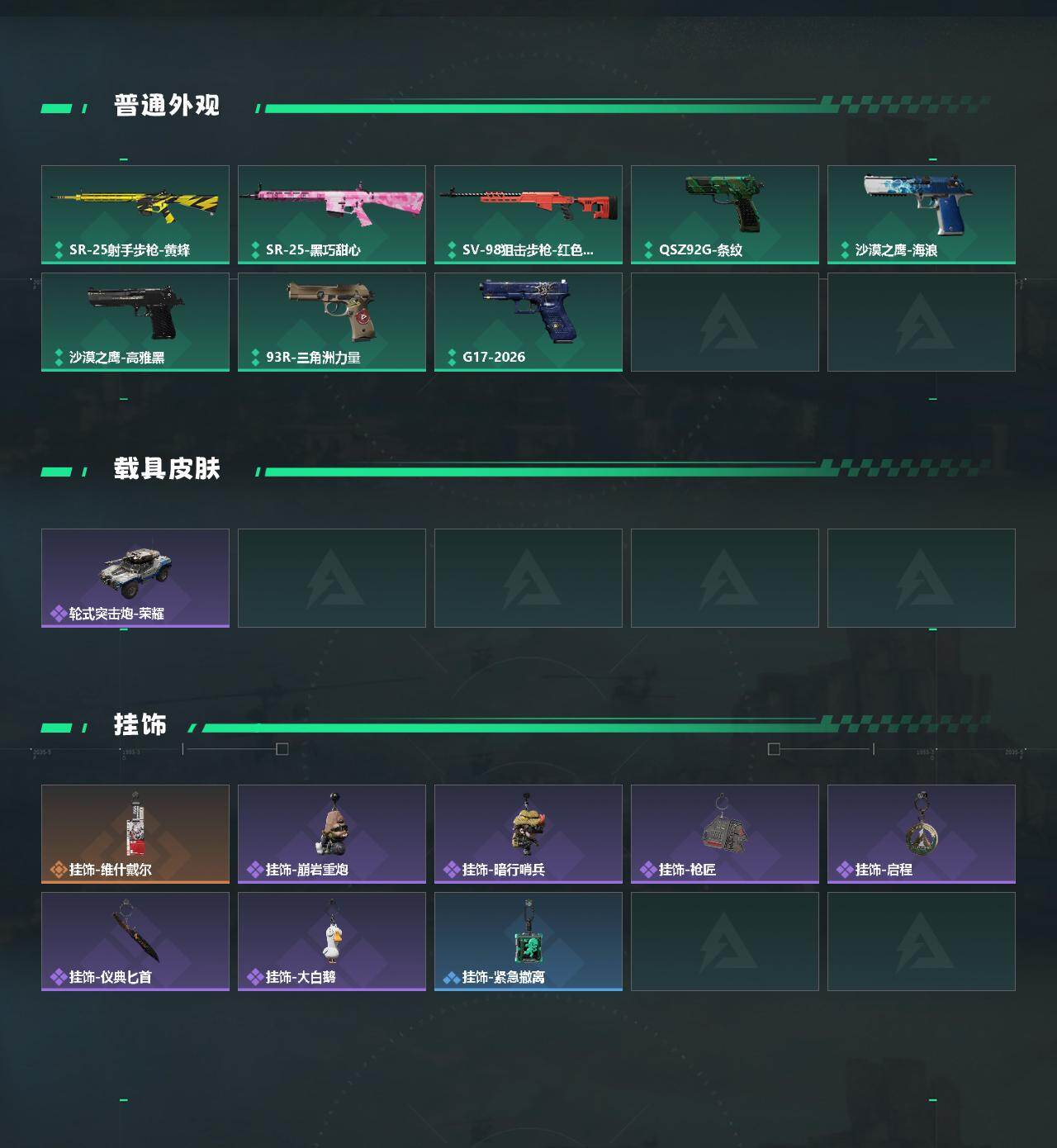 【稀有外观】:AKM突击步枪-肃杀,M7战斗步枪-捣蛋鬼,SG552突击步枪-2026,SCAR-H战斗步枪-荣耀列队,腾龙突击步枪-冰天雪地,MP5冲锋枪-弄臣,MP5冲锋枪-哈夫克卫队,P90冲锋枪-捣蛋鬼,Vector冲锋枪-先锋,UZI冲锋枪-亚特兰蒂斯,野牛冲锋枪-冰河潜伏者,SMG-45冲锋枪-行动开启,SMG-45冲锋枪-幻影结构,勇士冲锋枪-冰天雪地,QCQ171冲锋枪-银鹭,M1014霰弹枪-幻影结构,M249轻机枪-毛鲁斯之力,QJB201轻机枪-哈夫克卫队,Mini-14射手步枪-荣耀列队,SKS射手步枪-弄臣,SR-25射手步枪-开拓,SR9射手步枪-肃杀,SV-98狙击步枪-星链科技,SV-98狙击步枪-哈夫克航天,SV-98狙击步枪-精英联盟,G18-星链科技,G18-哈夫克航天