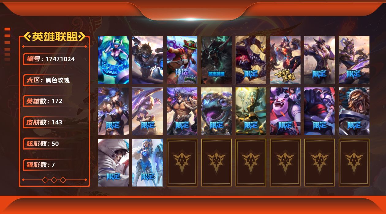 [17471024]黄金段位-172英雄-143皮肤-50炫彩-2终极-1神话-21限定-11传说-35史诗