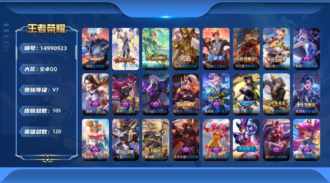 [14990923]【1628】安卓Q-V7-至尊星耀III段位-120英雄-105皮肤-1典藏皮肤-3传说-24史诗