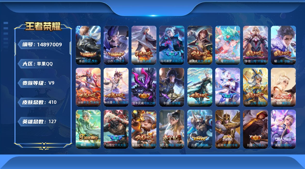 [14897009]【1627】苹果Q-V9-最强王者段位-127英雄-410皮肤-2典藏皮肤-27传说-130史诗 【英雄全皮】:钟馗全皮,太乙真人全皮,鬼谷子全皮,狂铁全皮,李信全皮,猪八戒全皮,蒙恬全皮,金蝉全皮,空空儿全皮,影全皮 【荣耀典藏】:小乔天鹅之梦,李白鸣剑曳影 【传说皮肤】:桑启鸣野蒿,貂蝉曦玄引,孙尚香乘龙问璇玑,孙策乘龙淬吴钩,赵云乘龙铭钟鼎,大乔时之奇旅,虞姬无限倾心,伽罗炽翼辉光,孙悟空齐天大圣,小乔山海琳琅生,曜山海苍雷引,李信山海炽霜斩,吕布怒海麟威,狄仁杰神器狴犴令,马可波罗深海之息,后羿无尽星芒,瑶时之祈愿,裴擒虎寅虎赤拳,鲁班七号寅虎瑞焰,小乔音你心动,虞姬启明星使,李信一念神魔,刘备时之恋人,后羿黄金射手座,李白凤求凰,宫本武藏地狱之眼,孙悟空地狱火 【限定皮肤】:白起狰,蔡文姬夏日便利店,大乔绒语心约,虞姬夏日便利店,姜子牙天穹之誓,狄仁杰阴阳师,廉颇寅虎御盾,小乔山海琳琅生,赵云皇家上将,墨子神迹守卫,嬴政白昼王子,孙尚香蔷薇恋人,鲁班七号狮舞东方,鲁班七号寅虎瑞焰,庄周高山流水,高渐离死亡摇滚,高渐离玩趣恶龙,钟无艳超时空战士,孙膑妖精王,孙膑寅虎展翼,扁鹊炼金王,扁鹊奇幻香踪,白起夜都怪侠,芈月重明,芈月幻夜卜梦,吕布猎兽之王,元歌无心,夏侯惇朔风刀,甄姬女儿国国王,甄姬游园惊梦,甄姬落雪兰心,曹操烛龙,典韦穷奇,典韦蓝屏警告,马可波罗深海之息,马可波罗山海玄木吟,狄仁杰魔术师,狄仁杰万华元夜,狄仁杰神器狴犴令,达摩星际陆战队,达摩沙漠行僧,项羽海滩派对,老夫子醍醐杖,老夫子航海奇遇记,程咬金演武夺筹,韩信傲雪梅枪,王昭君午后时光,兰陵王金庭之子,花木兰默契交锋,孙悟空大圣娶亲,孙悟空孙行者,孙悟空齐天大圣,牛魔御旌,后羿辉光之辰,后羿如梦令,后羿圣弓游侠,后羿无尽星芒,李元芳银河之约,李元芳云中旅人,虞姬启明星使,虞姬无限倾心,钟馗神迹守卫,钟馗驱傩正仪,杨玉环遇见飞天,杨玉环寅虎心曲,杨戬潮玩骑兵,女娲朔望之晖,干将莫邪真爱魔法,雅典娜黎明之约,蔡文姬繁星吟游,太乙真人饕餮,太乙真人华丽摇滚,鬼谷子原初探秘者,鬼谷子五谷丰年,大乔时之奇旅,黄忠火炮绅士,苏烈千军破阵,百里玄策原初追逐者,弈星混沌棋,梦奇顽趣,公孙离玉兔公主,沈梦溪大漠名商,明世隐疑决卦,明世隐吟游魔法,裴擒虎李小龙,裴擒虎寅虎赤拳,裴擒虎擒涛扼浪,狂铁御狮,狂铁电玩