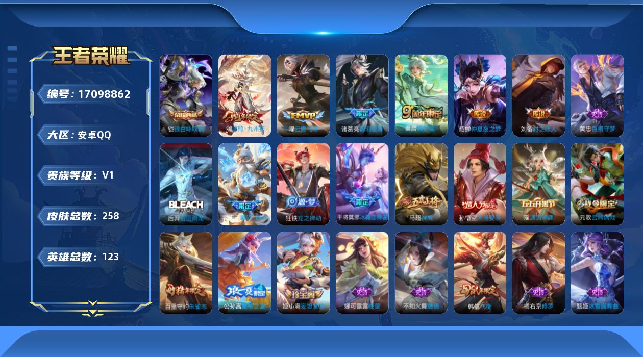- [11679947]V6 1典藏 2传说 123英雄 205皮肤 可修改实名 荣耀水晶:全息碎影(猴子典藏) 传说皮:地狱火 珍宝阁皮:蔷薇恋人,女武神 限定皮:愿照·九州拓(澜年限),高山流水,五谷丰年,游园惊梦,梁祝,李小龙 史诗皮:茶境仙,龙之律动,百相守梦-黄忠,蒙犽顽岩魄,芈月浮光幕影,怒海争锋,海诺心动手记,蔬乡物语(鲁班七号),电玩小子(小书包),白龙吟,江河有灵,高渐离燃音魔法,雪夜绮愿(周瑜),百解令(蒙犽),偶像歌手,龙骑士(小龙虾),末日机甲-吕布,猫狗日记-孙策,节奏热浪,修罗,女仆咖啡,摇滚巨星,水果甜心,心灵骇客,暗隐猎兽者,幽灵船长,鬼剑武藏,心灵战警,舞动绿茵,地狱岩魂,纤云弄巧,拒霜思,乘风破浪,逐浪之夏,金属风暴,鹰眼统帅,无心,未来纪元-赵云