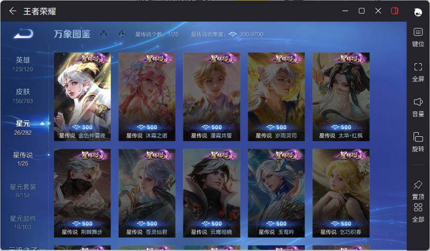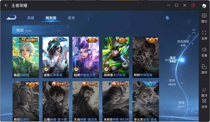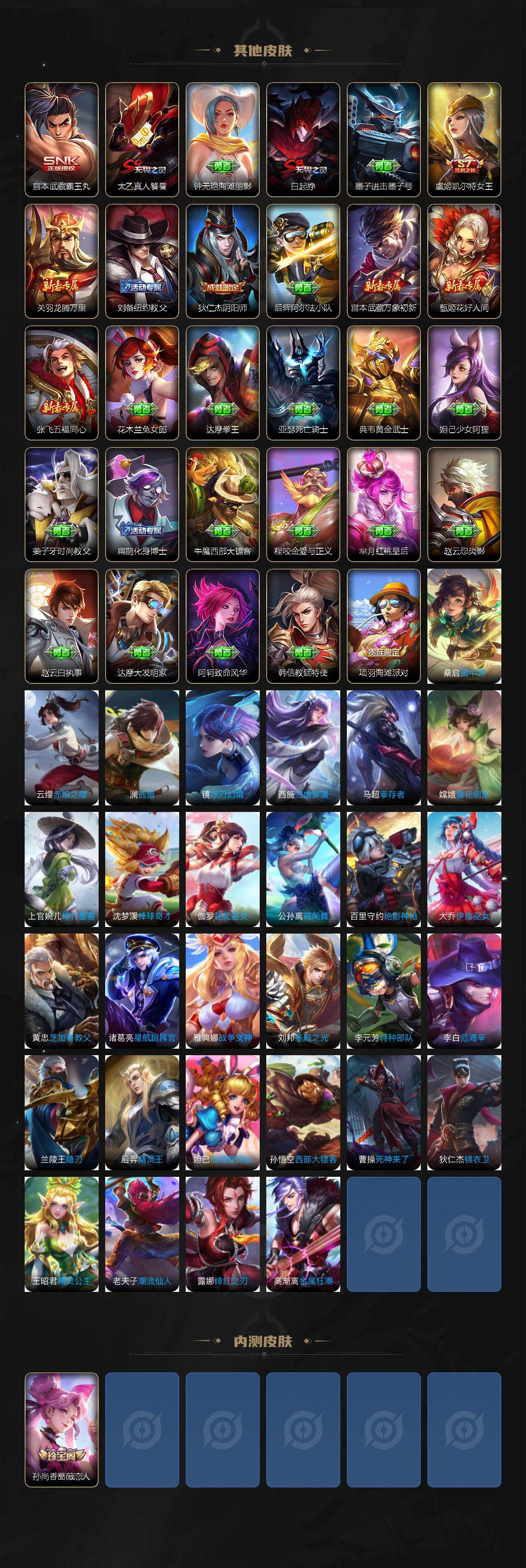 【赛季限定】:虞姬凯尔特女王,白起狰,太乙真人饕餮,曹操烛龙,芈月重明,典韦穷奇,狂铁御狮,米莱狄御霄,牛魔御旌,盾山御銮,夏侯惇朔风刀,弈星混沌棋,明世隐疑决卦,老夫子醍醐杖,鬼谷子原初探秘者,狄仁杰万华元夜,程咬金演武夺筹,钟馗驱傩正仪,苏烈千军破阵,达摩沙漠行僧,兰陵王金庭之子,沈梦溪大漠名商,李元芳云中旅人,桑启海盐诗旅,张良古海寻踪