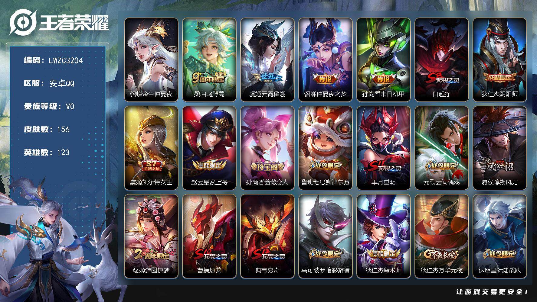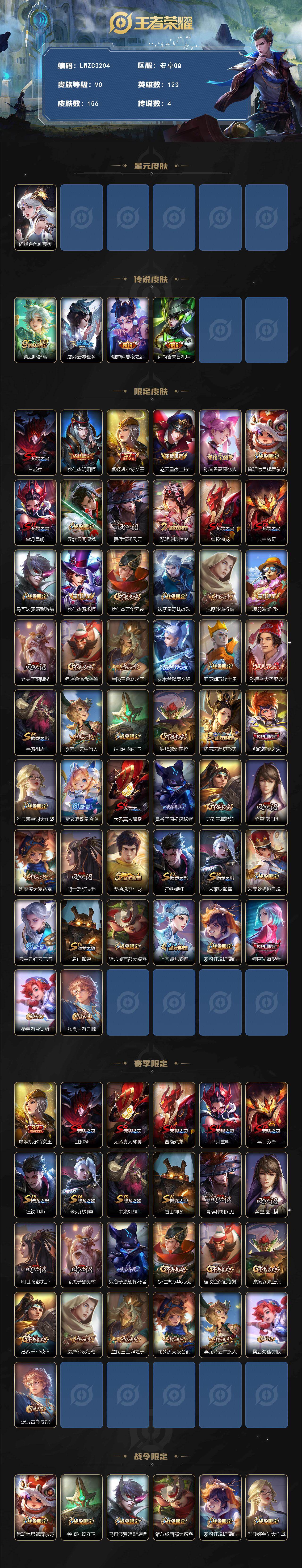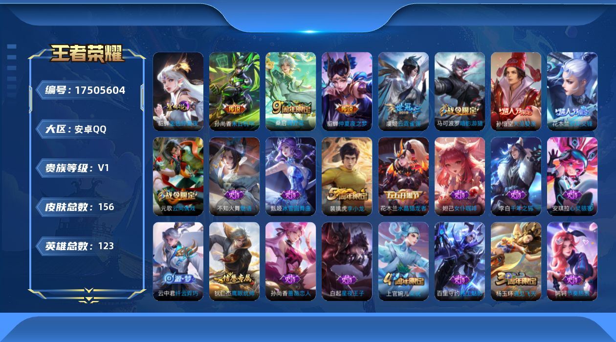 [17505604]可二次【特价出售/店主推荐】:安卓Q-V0-荣耀黄金IV段位-123英雄-156皮肤-4传说-1星传说-40史诗