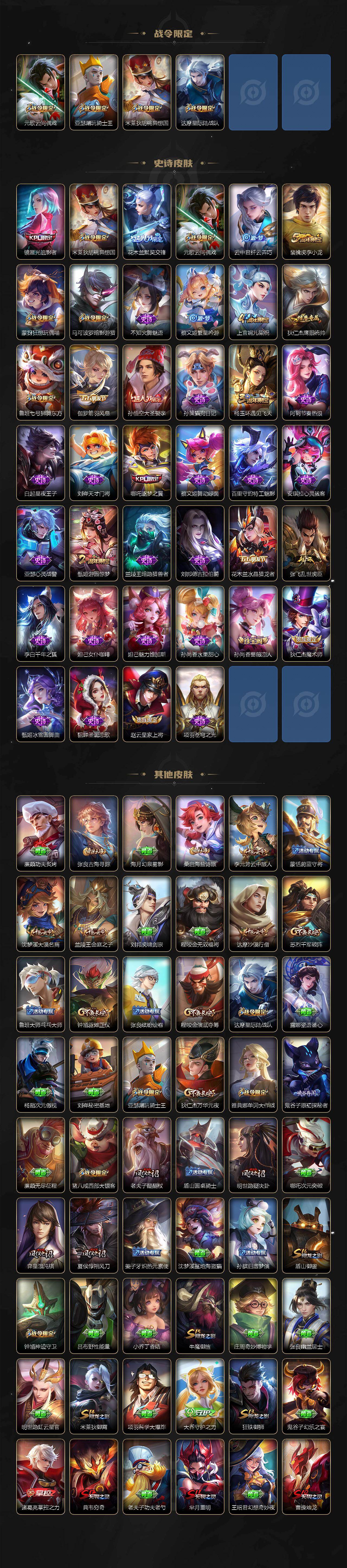 【限定皮肤】:白起狰,狄仁杰阴阳师,虞姬凯尔特女王,赵云皇家上将,孙尚香蔷薇恋人,鲁班七号狮舞东方,芈月重明,元歌云间偶戏,夏侯惇朔风刀,甄姬游园惊梦,曹操烛龙,典韦穷奇,马可波罗暗影游猎,狄仁杰魔术师,狄仁杰万华元夜,达摩星际陆战队,达摩沙漠行僧,项羽海滩派对,老夫子醍醐杖,程咬金演武夺筹,兰陵王金庭之子,花木兰默契交锋,亚瑟潮玩骑士王,孙悟空大圣娶亲,牛魔御旌,李元芳云中旅人,钟馗神迹守卫,钟馗驱傩正仪,杨玉环遇见飞天,哪吒逐梦之翼,雅典娜单词大作战,蔡文姬繁星吟游,太乙真人饕餮,鬼谷子原初探秘者,苏烈千军破阵,弈星混沌棋,沈梦溪大漠名商,明世隐疑决卦,裴擒虎李小龙,狂铁御狮,米莱狄御霄,米莱狄胡桃异想国,云中君纤云弄巧,盾山御銮,猪八戒西部大镖客,上官婉儿梁祝,蒙犽狂想玩偶喵,镜匿光追影者,桑启海盐诗旅,张良古海寻踪