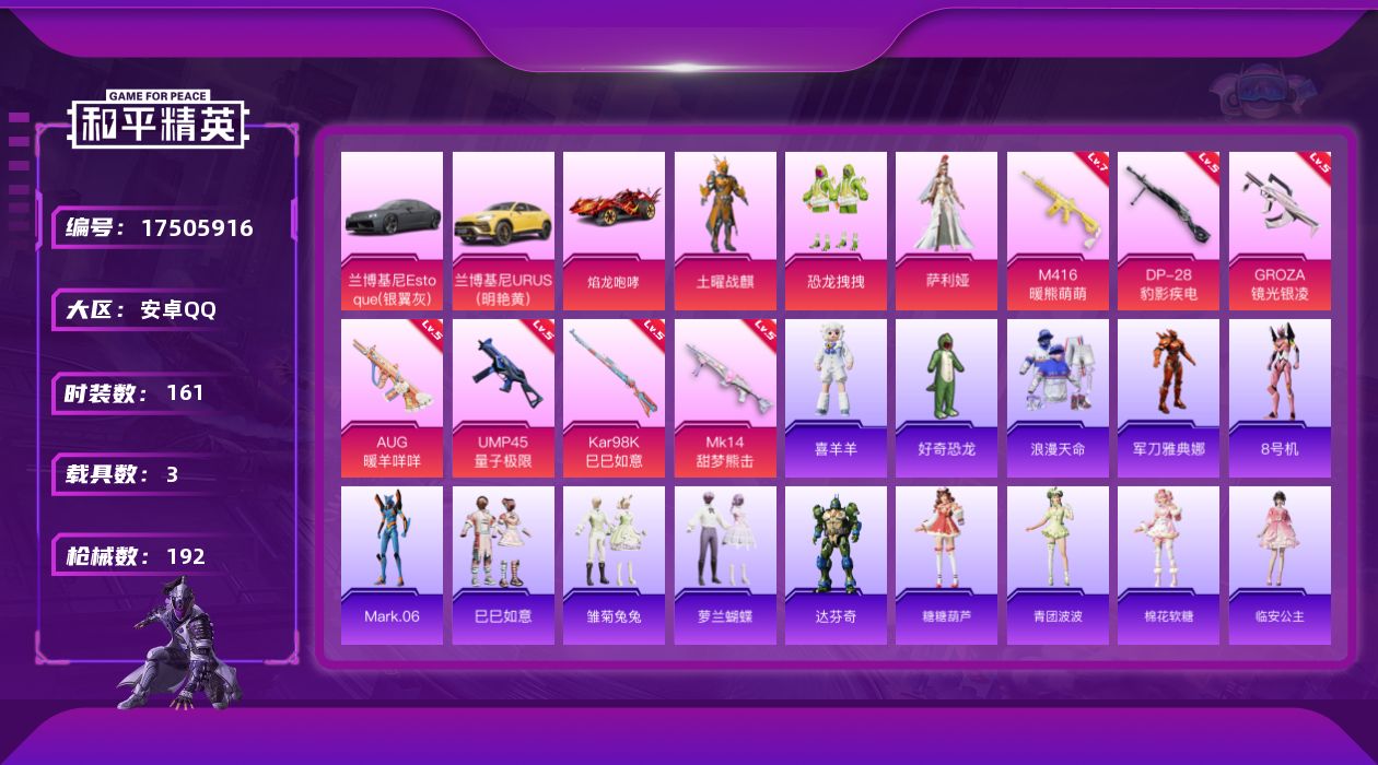 [17505916]安卓 手Q-3粉装-7特效枪-3载具-2粉色飞行器-66509热力值-10王牌印记-161套装-192枪皮【热门品类】:套装-浪漫天命,角色-军刀雅典娜,套装-SS1特训,角色-8号机,角色-Mark.06【粉色套装】:粉装-土曜战麒,粉装-恐龙拽拽,角色-萨利娅【粉色枪皮等级】:M416-暖熊萌萌(七级),GROZA-镜光银凌(五级),AUG-暖羊咩咩(五级),UMP45-量子极限(五级),Kar98K-巳巳如意(五级),Mk14-甜梦熊击(五级),DP-28-豹影疾电(五级)【粉色载具】:兰博基尼Estoque(银翼灰),兰博基尼URUS(明艳黄),焰龙咆哮【粉色枪皮】:M416-暖熊萌萌,GROZA-镜光银凌,AUG-暖羊咩咩,UMP45-量子极限,Kar98K-巳巳如意,Mk14-甜梦熊击,DP-28-豹影疾电【粉色飞行器】:脆鲨七海飞行器,动力核心飞行器