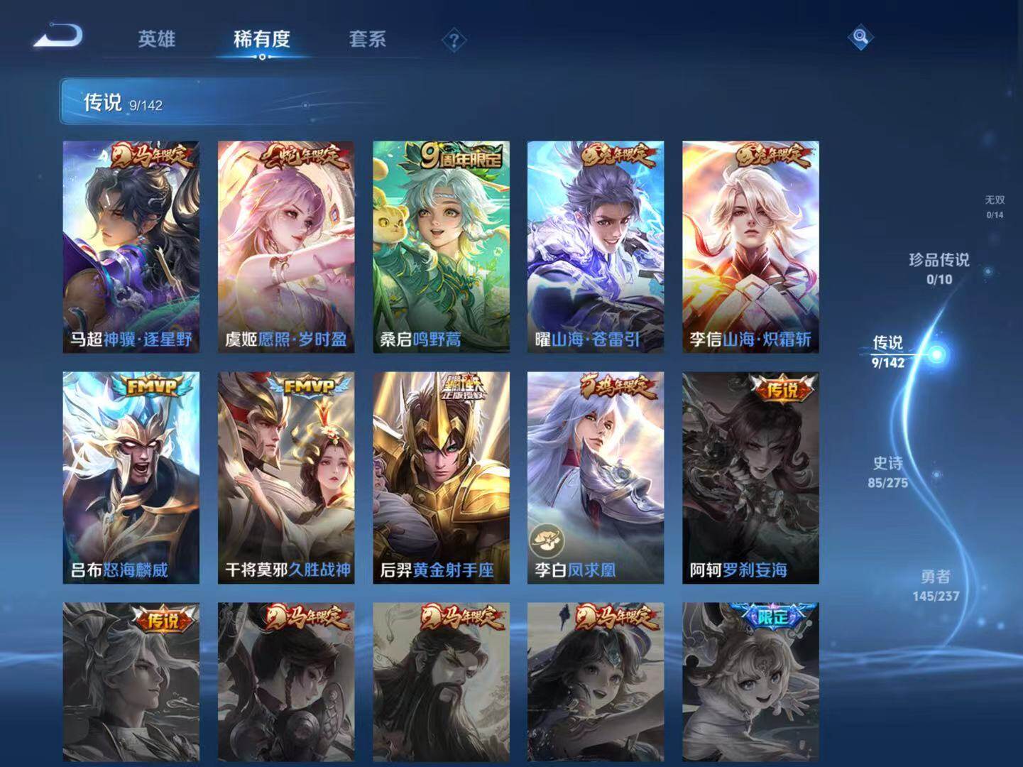【传说皮肤】:马超神骥逐星野,虞姬愿照岁时盈,桑启鸣野蒿,曜山海苍雷引,李信山海炽霜斩,吕布怒海麟威,干将莫邪久胜战神,后羿黄金射手座,李白凤求凰