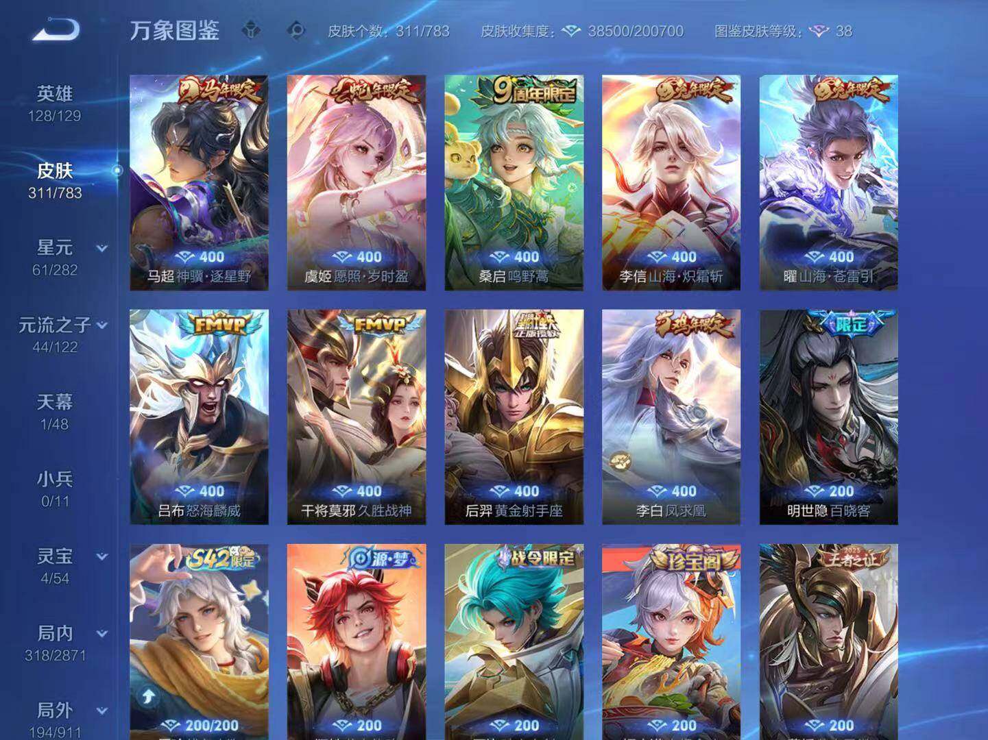 【限定皮肤】:姜子牙天穹之誓,狄仁杰阴阳师,赵云皇家上将,嬴政白昼王子,孙尚香蔷薇恋人,庄周高山流水,高渐离死亡摇滚,钟无艳超时空战士,扁鹊奇幻香踪,芈月幻夜卜梦,吕布猎兽之王,元歌无心,夏侯惇朔风刀,甄姬游园惊梦,甄姬落雪兰心,典韦蓝屏警告,典韦岱宗,马可波罗暗影游猎,马可波罗山海玄木吟,狄仁杰魔术师,狄仁杰万华元夜,达摩沙漠行僧,项羽海滩派对,老夫子醍醐杖,程咬金演武夺筹,王昭君午后时光,兰陵王金庭之子,孙悟空大圣娶亲,孙悟空孙行者,牛魔御旌,李元芳银河之约,李元芳云中旅人,钟馗驱傩正仪,杨戬潮玩骑兵,女娲朔望之晖,干将莫邪胡桃夹子,雅典娜单词大作战,蔡文姬繁星吟游,鬼谷子原初探秘者,鬼谷子五谷丰年,苏烈千军破阵,百里玄策原初追逐者,弈星混沌棋,梦奇顽趣,沈梦溪星空之诺,沈梦溪大漠名商,明世隐疑决卦,裴擒虎李小龙,裴擒虎擒涛扼浪,狂铁御狮,狂铁电玩高手,米莱狄御霄,云中君纤云弄巧,李信山海炽霜斩,盾山御銮,猪八戒西部大镖客,上官婉儿梁祝,嫦娥拒霜思,嫦娥暖冬兔眠,曜山海苍雷引,西施玲珑珍味,蒙犽狂想玩偶喵,鲁班大师探海日志,桑启海盐诗旅,暃星界游侠,戈娅驭风魔法,艾琳流音漫舞,司空震地狱燃心,阿古朵江河有灵,张良古海寻踪,蒙恬荣光圣徽,鬼谷子天穹祈灯,姬小满妄想食味,沈梦溪龙舞盛年,刘邦剑破天穹,程咬金群星魔术团,周瑜熔金海岸