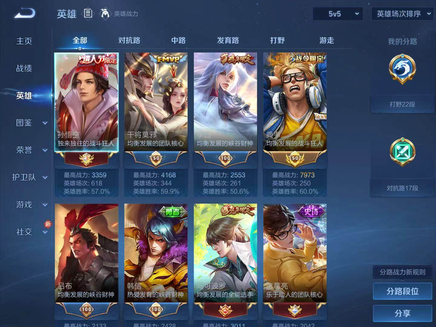 - [11445839]V5 2传说 119英雄 99皮肤 可修改实名 优质装备:地狱火,地狱之眼 珍宝阁皮:蔷薇恋人 限定皮:至尊宝,高山流水,五谷丰年,梁祝,李小龙 史诗皮:白龙吟,永昼,末日机甲-吕布,水果甜心,功夫厨神,暗隐猎兽者,幽灵船长,鬼剑武藏,水晶猎龙者,金属风暴,鹰眼统帅,魅力维加斯
