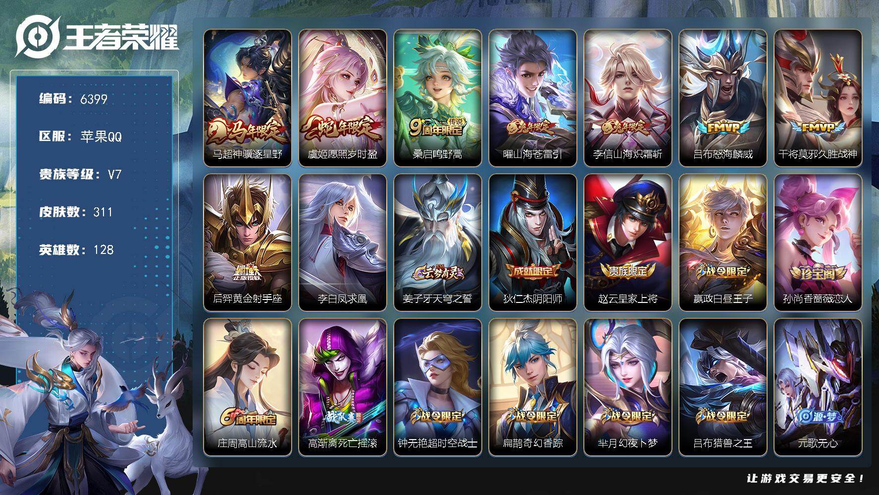 - [11607047]V8 1典藏 1珍品传说 16传说 125英雄 345皮肤 可修改实名 优质装备:鸣剑·曳影,怪盗基德,云鹰飞将(小将军),久胜战神,炽阳神光,末日机甲-孙尚香(绿蚂蚱),仲夏夜之梦(大飞蛾),零号·赤焰,地狱之眼,妄想实况,澜逐花归海 传说皮:幻光神枪 珍宝阁皮:胡桃夹子,万物之道,优雅恋人 限定皮:愿照·千秋盛(女娲年限),逐霄战戟,鸣野蒿,夏侯惇霜北刀,至尊宝,凤凰于飞,时雨天司(水龙头),飞衡(韩信年限),遇见飞天,高山流水,诗剑行,五谷丰年,梁祝,李小龙,默契交锋-花木兰,美猴王,山海·玄木吟(马可年限) 史诗皮:器灵·浮梦炉,化蝶舞,星界战将,谪仙醉月,龙之律动,雪豹·霜爪,茶境仙,怒海争锋,炽弈燎原,破空之剑,上官婉儿群星魔术团,百相守梦-百里守约,星界特工,百相守梦-黄忠,苍穹之光,白龙吟,特工魅影,千年之狐,江河有灵,百解令(蒙犽),高渐离燃音魔法,蒙恬荣光圣徽,无限星赏官,冰冠公主,青蛇,电玩·爆裂旋风,末日机甲-吕布,猫狗日记-孙策,猫狗日记-大乔,乱世虎臣,节奏热浪,修罗,摇滚巨星,水果甜心,绅士熊喵,天才门将,星夜王子,心灵骇客,功夫厨神,德古拉伯爵,暗隐猎兽者,幽灵船长,鬼剑武藏,暗渊魔法,心灵战警,天秀·启明,地狱岩魂,纤云弄巧,繁星吟游(呼啦呼啦),拒霜思,缤纷独角兽,乘风破浪,逐浪之夏,水晶猎龙者,曙光守护者,金属风暴,原初追逐者,圣诞狂欢,圣诞恋歌,鹰眼统帅,王者之锤,暗夜贵公子,黎明之约,无心,未来纪元-赵云