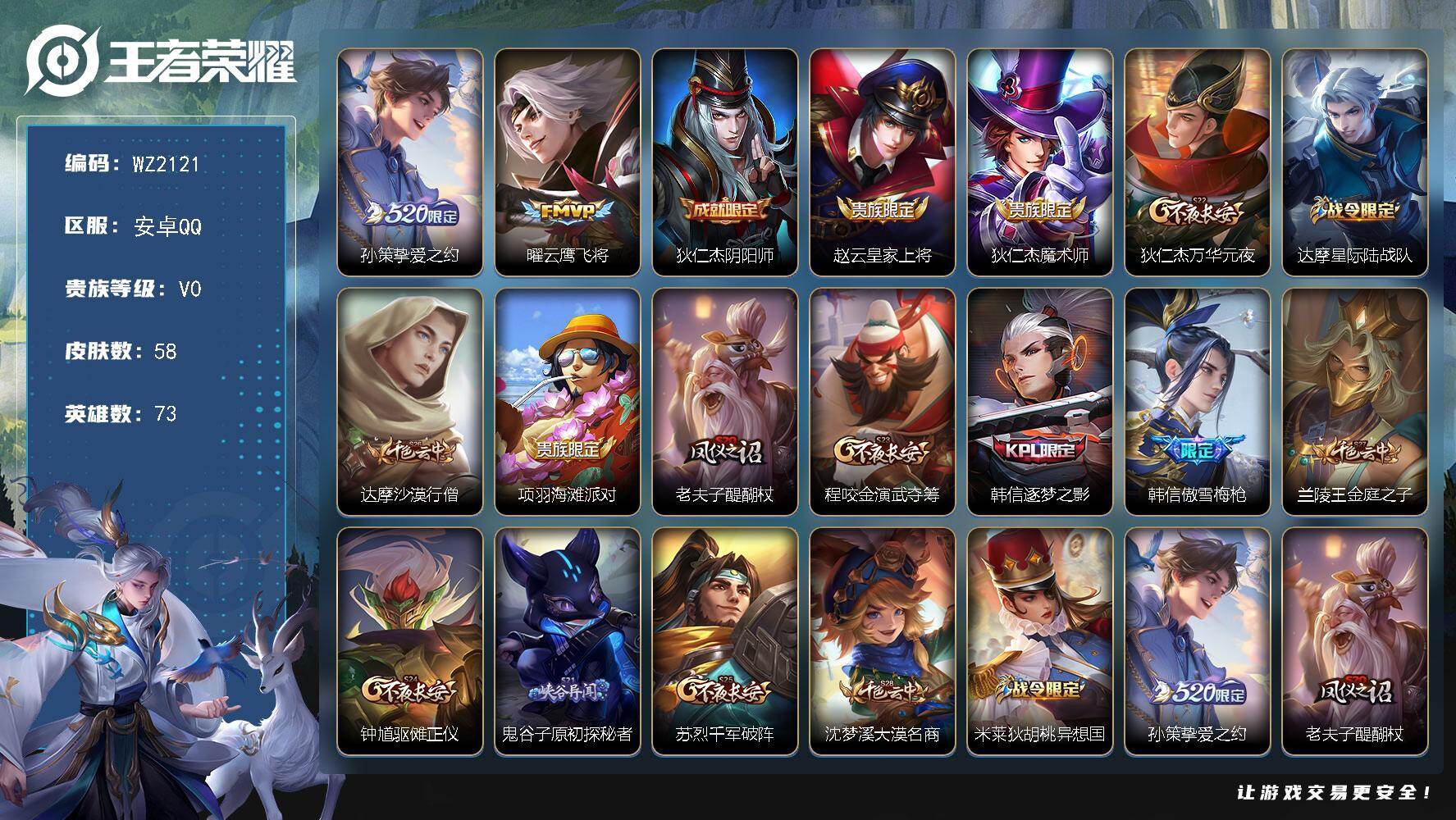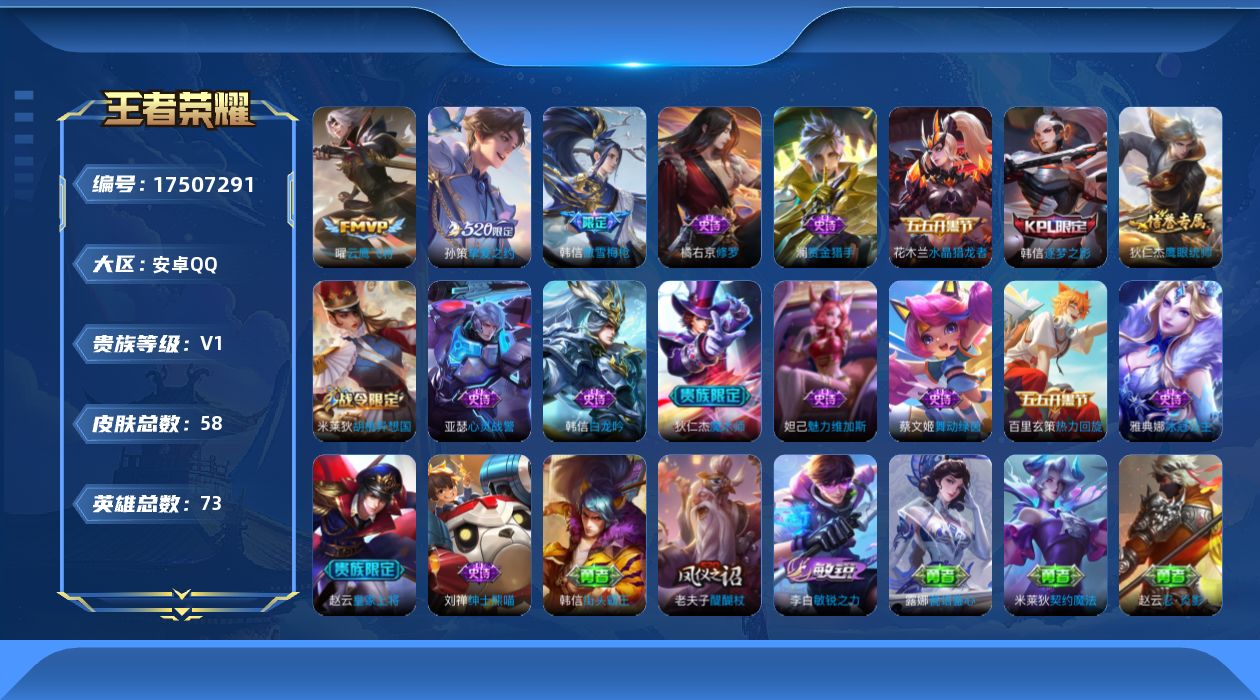 [17507291]安卓Q-58皮肤-2传说-16史诗 【传说皮肤】:孙策挚爱之约,曜云鹰飞将 【限定皮肤】:狄仁杰阴阳师,赵云皇家上将,狄仁杰魔术师,狄仁杰万华元夜,达摩星际陆战队,达摩沙漠行僧,项羽海滩派对,老夫子醍醐杖,程咬金演武夺筹,韩信逐梦之影,韩信傲雪梅枪,兰陵王金庭之子,钟馗驱傩正仪,鬼谷子原初探秘者,苏烈千军破阵,沈梦溪大漠名商,米莱狄胡桃异想国,孙策挚爱之约 【赛季限定】:老夫子醍醐杖,鬼谷子原初探秘者,狄仁杰万华元夜,程咬金演武夺筹,钟馗驱傩正仪,苏烈千军破阵,达摩沙漠行僧,兰陵王金庭之子,沈梦溪大漠名商 【战令限定】:米莱狄胡桃异想国,达摩星际陆战队 【史诗皮肤】:澜赏金猎手,韩信傲雪梅枪,百里玄策热力回旋,米莱狄胡桃异想国,橘右京修罗,狄仁杰鹰眼统帅,蔡文姬舞动绿茵,雅典娜冰冠公主,亚瑟心灵战警,韩信逐梦之影,花木兰水晶猎龙者,韩信白龙吟,刘禅绅士熊喵,妲己魅力维加斯,狄仁杰魔术师,赵云皇家上将 【其他皮肤】:沈梦溪大漠名商,米莱狄契约魔法,兰陵王金庭之子,达摩沙漠行僧,苏烈千军破阵,鲁班大师乓乓大师,钟馗驱傩正仪,张良缤纷绘卷,程咬金演武夺筹,达摩星际陆战队,露娜瓷语鉴心,杨戬次元傲视,狄仁杰万华元夜,鬼谷子原初探秘者,老夫子醍醐杖,庄周奇妙博物学,鬼谷子幻乐之宴,李白敏锐之力,诸葛亮掌控之力,狂铁命运角斗场,刘备纽约教父,狄仁杰阴阳师,宫本武藏万象初新,亚瑟死亡骑士,典韦黄金武士,芈月红桃皇后,赵云忍炎影,达摩大发明家,露娜哥特玫瑰,韩信街头霸王,韩信教廷特使,项羽海滩派对,澜孤猎,李信灼热之刃,司马懿魇语军师,李元芳特种部队,兰陵王隐刃,曹操死神来了,貂蝉异域舞娘,鲁班七号福禄兄弟 【营地ID】:1885019831