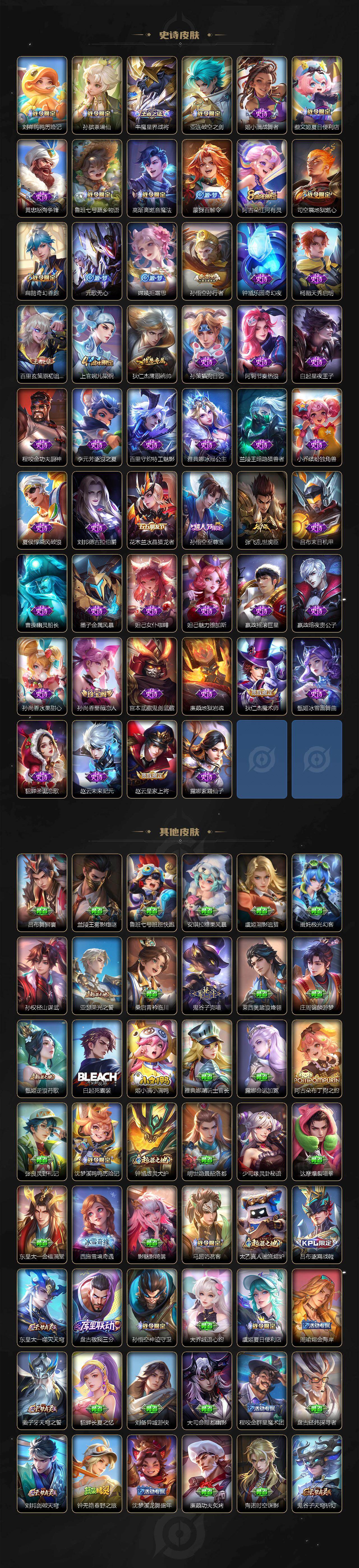 【史诗皮肤】:周瑜线条小狗,小乔线条小狗,项羽九幽镇关,公孙离涂山容容,黄忠百相守梦,狂铁龙之律动,刘禅鸭鸭历险记,孙膑茶境仙,牛魔星界战将,亚连破空之剑,姬小满战舞者,蔡文姬夏日便利店,黄忠怒海争锋,鲁班七号蔬乡物语,高渐离燃音魔法,蒙犽百解令,阿古朵江河有灵,司空震地狱燃心,扁鹊奇幻香踪,元歌无心,嫦娥拒霜思,孙悟空孙行者,钟馗乐园奇幻夜,杨戬天秀启明,百里玄策原初追逐者,上官婉儿梁祝,狄仁杰鹰眼统帅,孙策猫狗日记,阿轲节奏热浪,白起星夜王子,程咬金功夫厨神,李元芳逐浪之夏,百里守约特工魅影,雅典娜冰冠公主,兰陵王暗隐猎兽者,小乔缤纷独角兽,夏侯惇乘风破浪,刘邦德古拉伯爵,花木兰水晶猎龙者,孙悟空至尊宝,张飞乱世虎臣,吕布末日机甲,曹操幽灵船长,墨子金属风暴,妲己女仆咖啡,妲己魅力维加斯