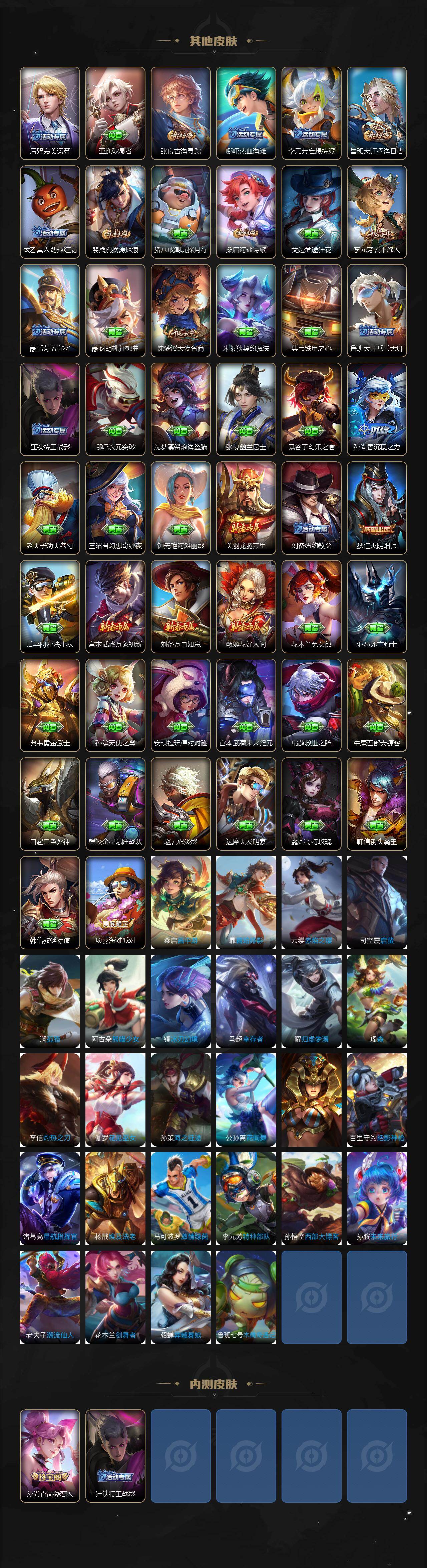 【限定皮肤】:蔡文姬夏日便利店,大乔绒语心约,虞姬夏日便利店,姜子牙天穹之誓,狄仁杰阴阳师,赵云皇家上将,孙尚香蔷薇恋人,扁鹊奇幻香踪,元歌无心,狄仁杰魔术师,项羽海滩派对,孙悟空至尊宝,孙悟空孙行者,李元芳云中旅人,百里玄策原初追逐者,沈梦溪大漠名商,裴擒虎擒涛扼浪,上官婉儿梁祝,嫦娥拒霜思,鲁班大师探海日志,桑启海盐诗旅,司空震地狱燃心,阿古朵江河有灵,张良古海寻踪,蒙犽百解令,高渐离燃音魔法,鬼谷子天穹祈灯,马超琥珀纪元,沈梦溪龙舞盛年,鲁班七号蔬乡物语,刘邦剑破天穹,程咬金群星魔术团,刘备异域游侠,周瑜熔金海岸