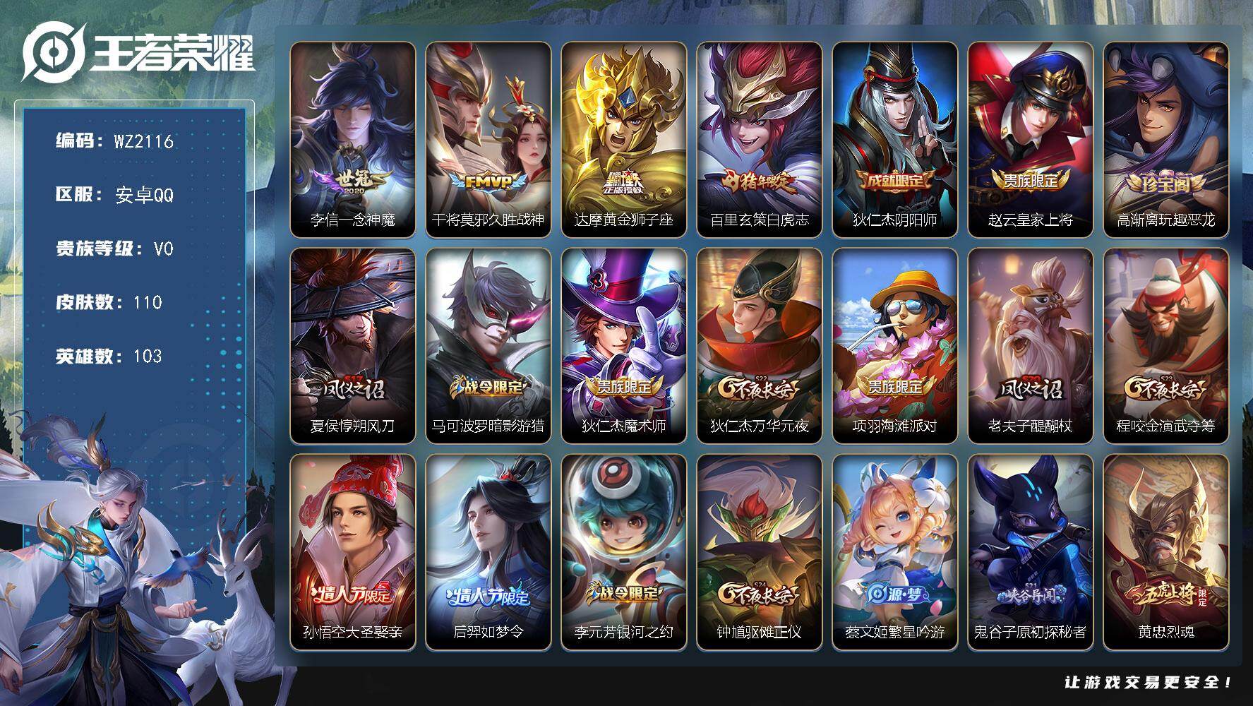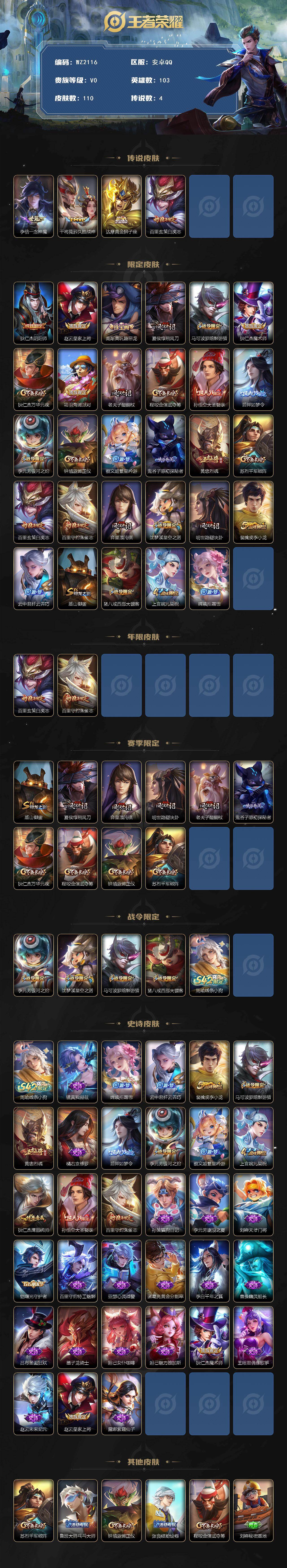 [17507468]安卓Q-110皮肤-4传说-32史诗 【传说皮肤】:李信一念神魔,干将莫邪久胜战神,达摩黄金狮子座,百里玄策白虎志 【限定皮肤】:狄仁杰阴阳师,赵云皇家上将,高渐离玩趣恶龙,夏侯惇朔风刀,马可波罗暗影游猎,狄仁杰魔术师,狄仁杰万华元夜,项羽海滩派对,老夫子醍醐杖,程咬金演武夺筹,孙悟空大圣娶亲,后羿如梦令,李元芳银河之约,钟馗驱傩正仪,蔡文姬繁星吟游,鬼谷子原初探秘者,黄忠烈魂,苏烈千军破阵,百里玄策白虎志,百里守约朱雀志,弈星混沌棋,沈梦溪星空之诺,明世隐疑决卦,裴擒虎李小龙,云中君纤云弄巧,盾山御銮,猪八戒西部大镖客,上官婉儿梁祝,嫦娥拒霜思 【年限皮肤】:百里玄策白虎志,百里守约朱雀志 【赛季限定】:盾山御銮,夏侯惇朔风刀,弈星混沌棋,明世隐疑决卦,老夫子醍醐杖,鬼谷子原初探秘者,狄仁杰万华元夜,程咬金演武夺筹,钟馗驱傩正仪,苏烈千军破阵 【战令限定】:李元芳银河之约,沈梦溪星空之诺,马可波罗暗影游猎,猪八戒西部大镖客,周瑜线条小狗 【史诗皮肤】:周瑜线条小狗,镜真我赫兹,嫦娥拒霜思,云中君纤云弄巧,裴擒虎李小龙,马可波罗暗影游猎,黄忠烈魂,橘右京修罗,后羿如梦令,李元芳银河之约,蔡文姬繁星吟游,上官婉儿梁祝,狄仁杰鹰眼统帅,孙悟空大圣娶亲,百里守约朱雀志,孙策猫狗日记,李元芳逐浪之夏,刘禅天才门将,铠曙光守护者,百里守约特工魅影,亚瑟心灵战警,诸葛亮黄金分割率,李白千年之狐,曹操幽灵船长,吕布圣诞狂欢,墨子龙骑士,妲己女仆咖啡,妲己魅力维加斯,狄仁杰魔术师,王昭君偶像歌手,赵云未来纪元,赵云皇家上将,露娜紫霞仙子 【其他皮肤】:苏烈千军破阵,鲁班大师乓乓大师,钟馗驱傩正仪,张良缤纷绘卷,程咬金演武夺筹,刘禅秘密基地,狄仁杰万华元夜,鬼谷子原初探秘者,猪八戒西部大镖客,老夫子醍醐杖,盾山圆桌骑士,明世隐疑决卦,弈星混沌棋,沈梦溪星空之诺,夏侯惇朔风刀,姜子牙炽热元素使,沈梦溪鲨炮海盗猫,高渐离玩趣恶龙,孙膑归虚梦演,盾山御銮,吕布野性能量,明世隐虹云星官,项羽科学大爆炸,老夫子功夫老勺,宫本武藏霸王丸,钟无艳海滩丽影,关羽龙腾万里,刘备汉昭烈帝,狄仁杰阴阳师,后羿阿尔法小队,宫本武藏万象初新,甄姬花好人间,花木兰兔女郎,达摩拳王,亚瑟死亡骑士,典韦黄金武士,妲己少女阿狸,扁鹊化身博士,程咬金星际陆战队,芈月红桃皇后,露娜哥特玫瑰,韩信街头霸王,韩信教廷特使,