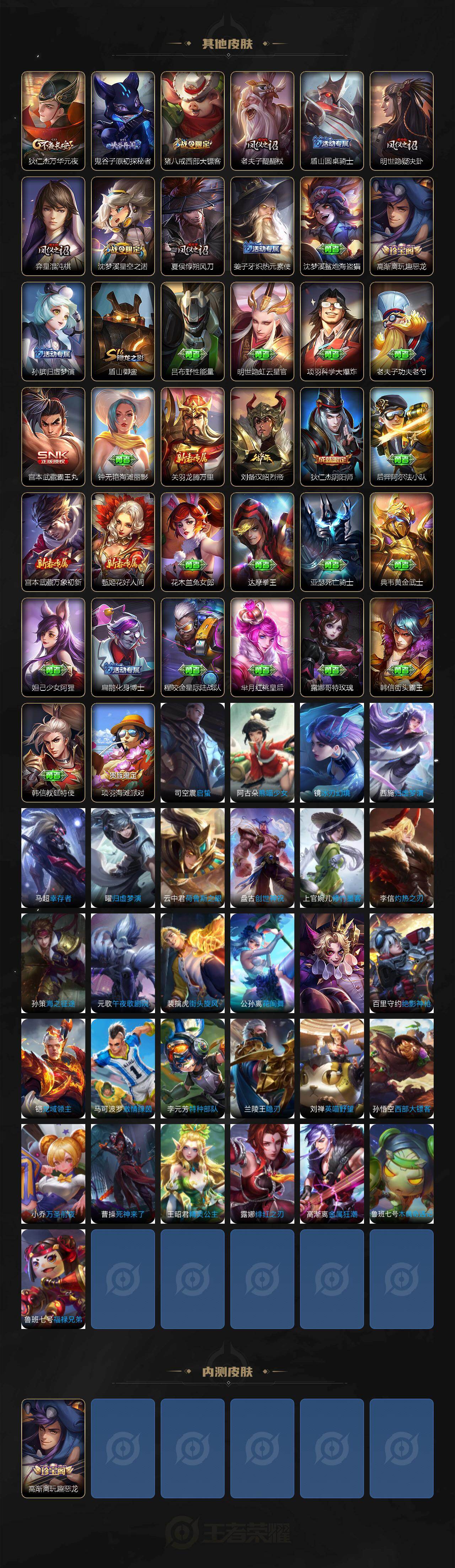 【其他皮肤】:苏烈千军破阵,鲁班大师乓乓大师,钟馗驱傩正仪,张良缤纷绘卷,程咬金演武夺筹,刘禅秘密基地,狄仁杰万华元夜,鬼谷子原初探秘者,猪八戒西部大镖客,老夫子醍醐杖,盾山圆桌骑士,明世隐疑决卦,弈星混沌棋,沈梦溪星空之诺,夏侯惇朔风刀,姜子牙炽热元素使,沈梦溪鲨炮海盗猫,高渐离玩趣恶龙,孙膑归虚梦演,盾山御銮,吕布野性能量,明世隐虹云星官,项羽科学大爆炸,老夫子功夫老勺,宫本武藏霸王丸,钟无艳海滩丽影,关羽龙腾万里,刘备汉昭烈帝,狄仁杰阴阳师,后羿阿尔法小队,宫本武藏万象初新,甄姬花好人间,花木兰兔女郎,达摩拳王,亚瑟死亡骑士,典韦黄金武士,妲己少女阿狸,扁鹊化身博士,程咬金星际陆战队,芈月红桃皇后,露娜哥特玫瑰,韩信街头霸王,韩信教廷特使,