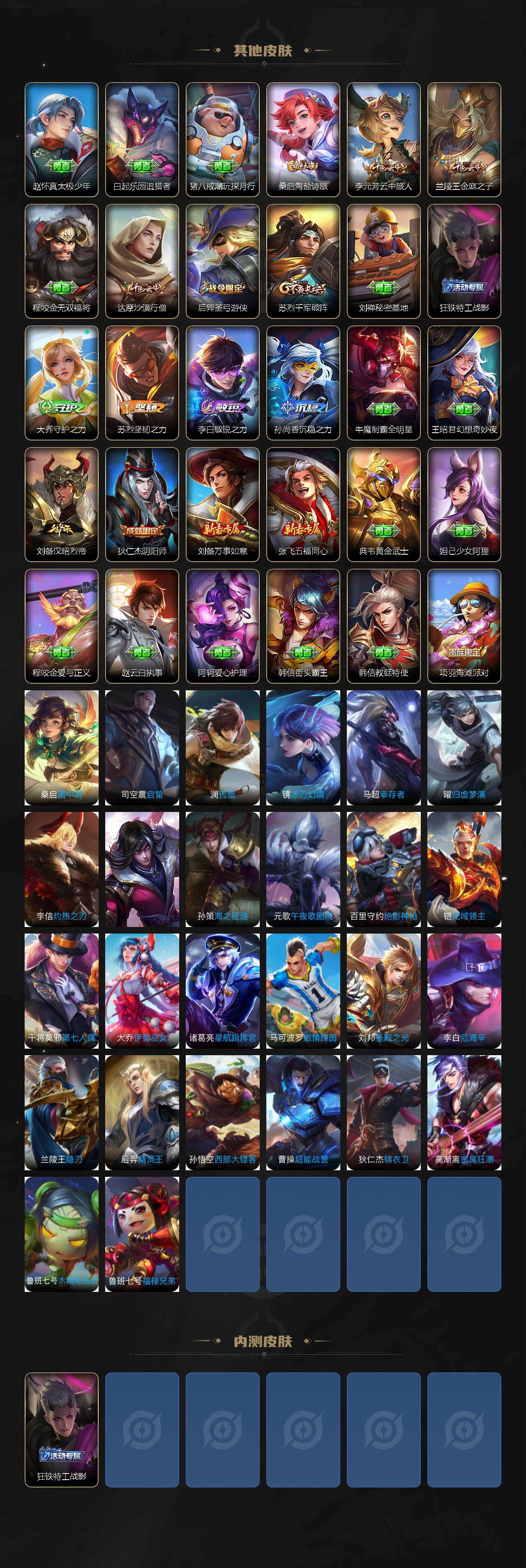 【其他皮肤】:吕布舞狮寰,鲁班七号班班快跑,虞姬溯影追猎,明世隐往忆晖光,亚瑟荣光之誓,大司命暗都幽影,沈梦溪龙舞盛年,张良古海寻踪,艾琳流音漫舞,鲁班大师探海日志,莱西奥西部游侠,裴擒虎擒涛扼浪,赵怀真太极少年,白起乐园追猎者,猪八戒潮玩探月行,桑启海盐诗旅,李元芳云中旅人,兰陵王金庭之子,程咬金无双福将,达摩沙漠行僧,后羿圣弓游侠,苏烈千军破阵,刘禅秘密基地,狂铁特工战影,大乔守护之力,苏烈坚韧之力,李白敏锐之力,孙尚香沉稳之力,牛魔制霸全明星,王昭君幻想奇妙夜,刘备汉昭烈帝,狄仁杰阴阳师,刘备万事如意,张飞五福同心,典韦黄金武士,妲己少女阿狸,程咬金爱与正义,赵云白执事,阿轲爱心护理,韩信街头霸王,韩信教廷特使,项羽海滩派对,桑启画中游,司空震启蛰,澜孤猎,镜冰刃幻境,马超幸存者,曜归虚梦演,李信灼热之刃,司马懿魇语军师,孙策海之征途,元歌午夜歌剧院,百里守约绝影神枪,铠龙域领主,干将莫邪第七人偶,大乔伊势巫女,诸葛亮星航指挥官,马可波罗激情绿茵,刘邦圣殿之光,李白范海辛,兰陵王隐
