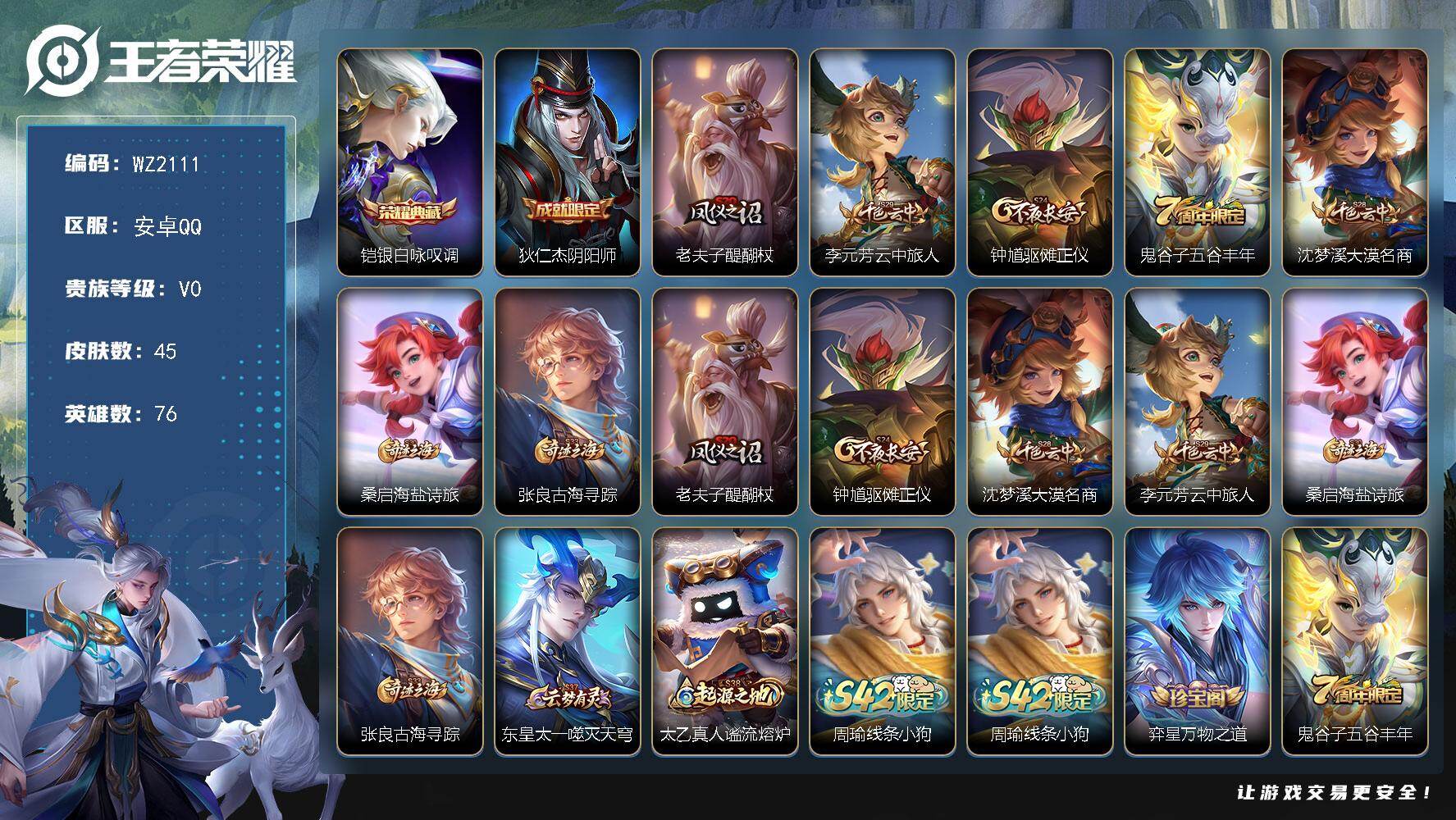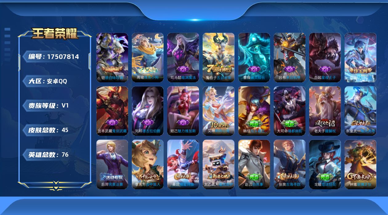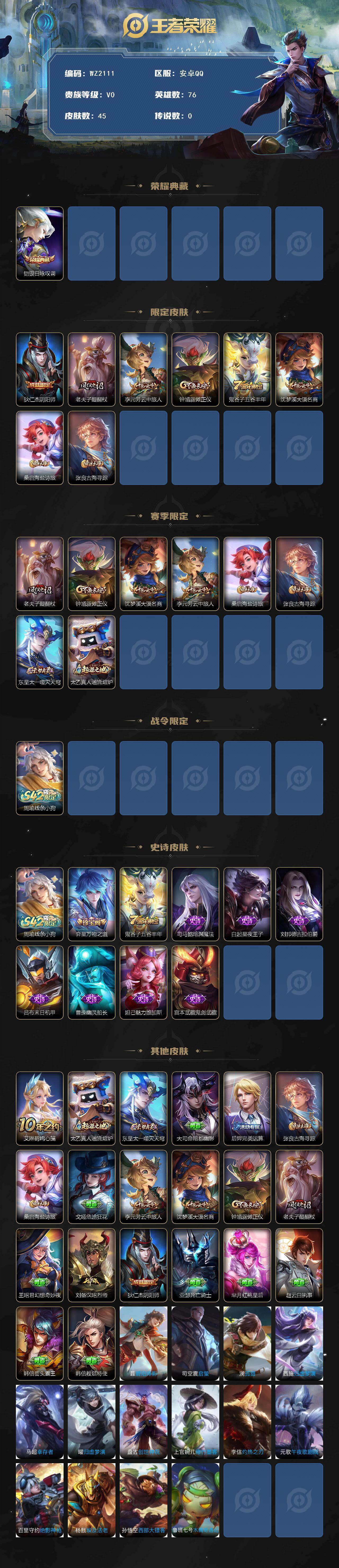 [17507814]安卓Q-45皮肤-1典藏皮肤-9史诗 【荣耀典藏】:铠银白咏叹调 【限定皮肤】:狄仁杰阴阳师,老夫子醍醐杖,李元芳云中旅人,钟馗驱傩正仪,鬼谷子五谷丰年,沈梦溪大漠名商,桑启海盐诗旅,张良古海寻踪 【赛季限定】:老夫子醍醐杖,钟馗驱傩正仪,沈梦溪大漠名商,李元芳云中旅人,桑启海盐诗旅,张良古海寻踪,东皇太一噬灭天穹,太乙真人谧流熔炉 【战令限定】:周瑜线条小狗 【史诗皮肤】:周瑜线条小狗,弈星万物之道,鬼谷子五谷丰年,司马懿暗渊魔法,白起星夜王子,刘邦德古拉伯爵,吕布末日机甲,曹操幽灵船长,妲己魅力维加斯,宫本武藏鬼剑武藏 【其他皮肤】:艾琳鹤鸣心笺,太乙真人谧流熔炉,东皇太一噬灭天穹,大司命暗都幽影,后羿完美运算,张良古海寻踪,桑启海盐诗旅,戈娅危途狂花,李元芳云中旅人,沈梦溪大漠名商,钟馗驱傩正仪,老夫子醍醐杖,王昭君幻想奇妙夜,刘备汉昭烈帝,狄仁杰阴阳师,亚瑟死亡骑士,芈月红桃皇后,赵云白执事,韩信街头霸王,韩信教廷特使,暃碧珀绯影,司空震启蛰,澜孤猎,西施归虚梦演,马超幸存者,曜归虚梦演,盘古创世神祝,上官婉儿修竹墨客,李信灼热之刃,元歌午夜歌剧院,百里守约绝影神枪,杨戬埃及法老,孙悟空西部大镖客,鲁班七号木偶奇遇记 【营地ID】:1626125017
