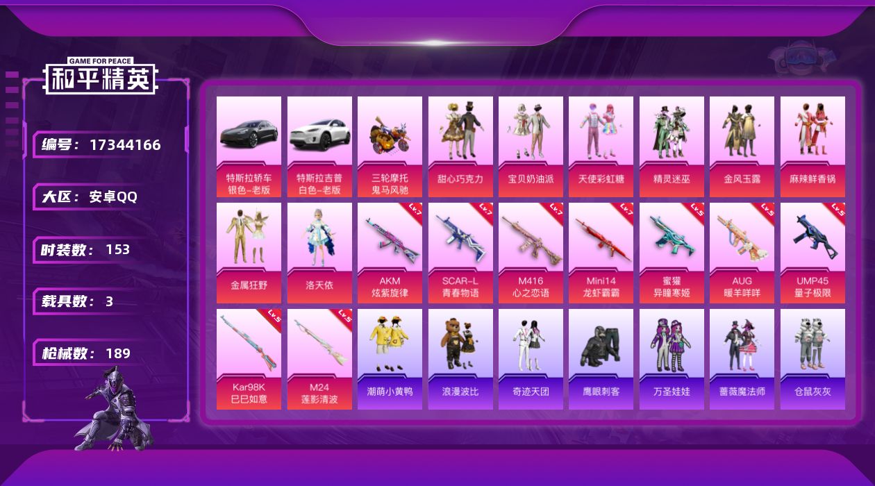 [17344166]安卓 手Q-8粉装-11特效枪-3载具-4粉色飞行器-77619热力值-10王牌印记-153套装-189枪皮 【热门品类】:套装-龟仙人,套装-潮萌小黄鸭,套装-暗影哥特,套装-浪漫波比 【粉色套装】:粉装-甜心巧克力,粉装-宝贝奶油派,粉装-天使彩虹糖,粉装-精灵迷巫,粉装-金风玉露,粉装-麻辣鲜香锅,粉装-金属狂野,角色-洛天依 【粉色枪皮等级】:AKM-炫紫旋律(七级),SCAR-L-青春物语(七级),M416-心之恋语(七级),AUG-暖羊咩咩(五级),蜜獾-异瞳寒姬(五级),UMP45-量子极限(五级),AKS-74U-森灵之息(五级),Kar98K-巳巳如意(五级),M24-莲影清波(五级),Mini14-龙虾霸霸(七级),Mk14-福马献瑞(五级) 【粉色载具】:特斯拉Model 3(冷光银),特斯拉Model X(珍珠白),鬼马风驰 【粉色枪皮】:AKM-炫紫旋律,SCAR-L-青春物语,M416-心之恋语,AUG-暖羊咩咩,蜜獾-异瞳寒姬,UMP45-量子极限,AKS-74U-森灵之息,Kar98K-巳巳如意,M24-莲影清波,Mini14-龙虾霸霸,Mk14-福马献瑞 【粉色飞行器】:深海曼妙飞行器,精灵迷巫飞行器,炫紫旋律飞行器,心之恋语飞行翼 【粉色降落伞】:深海曼妙降落伞,甜心宝贝降落伞,精灵迷巫降落伞,华贵君王降落伞,星之信仰降落伞,金风玉露降落伞,龙虾霸霸降落伞,炫紫旋律降落伞,神秘黑猫降落伞,甜蜜誓约降落伞,花间之火降落伞,潮汐统领降落伞,莲影清波降落伞,异瞳寒姬降落伞,炫彩糖果降落伞 【稀有套装】:套装-龟仙人,套装-巳巳如意,套装-雪国风尚,角色-月烬之祷 【稀有枪皮】:AKM-四圣焕新,AKM-缤纷海域,AKM-霓虹街区,AKM-龙的传人,M16A4-九霄,M16A4-莲影清波,M16A4-魔法学院,M16A4-龙虾霸霸,SCAR-L-炫彩节奏,SCAR-L-红色方程式,SCAR-L-金风玉露,SCAR-L-龙宫之主,M416-仓鼠灰灰,M416-潮汐统领,M416-神秘黑猫,M416-魔法学院,GROZA-黑色刀锋,AUG-魔法学院,QBZ-九霄,QBZ-原初圣火,QBZ-洛神天依,QBZ-神秘黑猫,QBZ-诡娃娃,M762-拳皇97,M762-深海曼妙,M762-潮萌小黄鸭,M762-牛气冲天,M762-瑞龙福将,M762