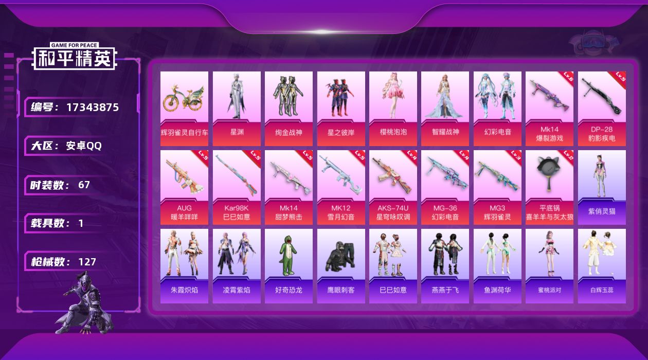 [17343875]安卓 手Q-6粉装-12特效枪-1载具-4粉色飞行器-37681热力值-2王牌印记-67套装-127枪皮 【粉色套装】:粉装-绚金战神,粉装-星之彼岸,角色-樱桃泡泡,角色-智耀战神,粉装-幻彩电音,角色-星渊 【粉色枪皮等级】:AUG-暖羊咩咩(五级),AKS-74U-星穹咏叹调(四级),Kar98K-巳巳如意(五级),Mk14-甜梦熊击(五级),Mk14-爆裂游戏(六级),Mk14-福马献瑞(五级),MK12-雪月幻音(五级),AA12-G-萌骑幻想(四级),DP-28-豹影疾电(五级),MG3-辉羽雀灵(三级),MG-36-幻彩电音(四级),平底锅-喜羊羊与灰太狼(二级) 【粉色载具】:辉羽雀灵自行车 【粉色枪皮】:AUG-暖羊咩咩,AKS-74U-星穹咏叹调,Kar98K-巳巳如意,Mk14-甜梦熊击,Mk14-爆裂游戏,Mk14-福马献瑞,MK12-雪月幻音,AA12-G-萌骑幻想,DP-28-豹影疾电,MG3-辉羽雀灵,MG-36-幻彩电音,平底锅-喜羊羊与灰太狼 【粉色飞行器】:炫彩糖果飞行器,齐天大圣飞行器,镜光幻境飞行翼,雀灵庇佑飞行器 【粉色降落伞】:齐天大圣降落伞,歌者泠鸢降落伞,智耀战神降落伞,圣斗士星矢降落伞,绯果甜心降落伞,星穹咏叹调降落伞,辉羽雀灵降落伞,幻星舰长降落伞,幻彩电音降落伞,双重狂想降落伞,冷漠罗丽降落伞,喜羊羊与灰太狼降落伞,异瞳寒姬降落伞 【稀有套装】:套装-巳巳如意,套装-雪国风尚,套装-燕燕于飞,套装-鱼渊荷华,角色-蜜桃派对,套装-白辉玉蕊,套装-粉恋花,套装-紫幽梦,套装-蓝冰羽,套装-星影赞美诗,套装-星渊小夜曲,套装-虚空漩涡,套装-霓虹热舞,套装-极速光影,套装-雪绒豹,套装-诡诞巡游,套装-朱霞炽焰,套装-凌霄紫焰,角色-紫俏灵猫,套装-雨过天青,套装-红釉青花 【稀有枪皮】:AKM-影袭,SCAR-L-夜灯,SCAR-L-炫彩节奏,SCAR-L-玉兔迎春,M416-萌萌史莱姆,GROZA-影袭,GROZA-酷泡奶龙,AUG-耀粉歌者,M762-天降萌叽,M762-云朵鹅,Mk47-湮灭星辰,G36C-星穹咏叹调,蜜獾-天降萌叽,蜜獾-御兔特攻,Famas-湮灭星辰,ARX-凌霄紫焰,UZI-影袭,UMP45-夜灯,Vector-风花雪月,AKS-74U-辉羽雀灵,JS9-凌霄紫焰,P90-巳巳如意,K