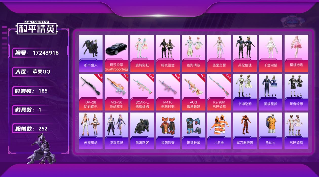 [17243916]苹果 手Q-7粉装-7特效枪-1载具-2粉色飞行器-72692热力值-10王牌印记-185套装-252枪皮