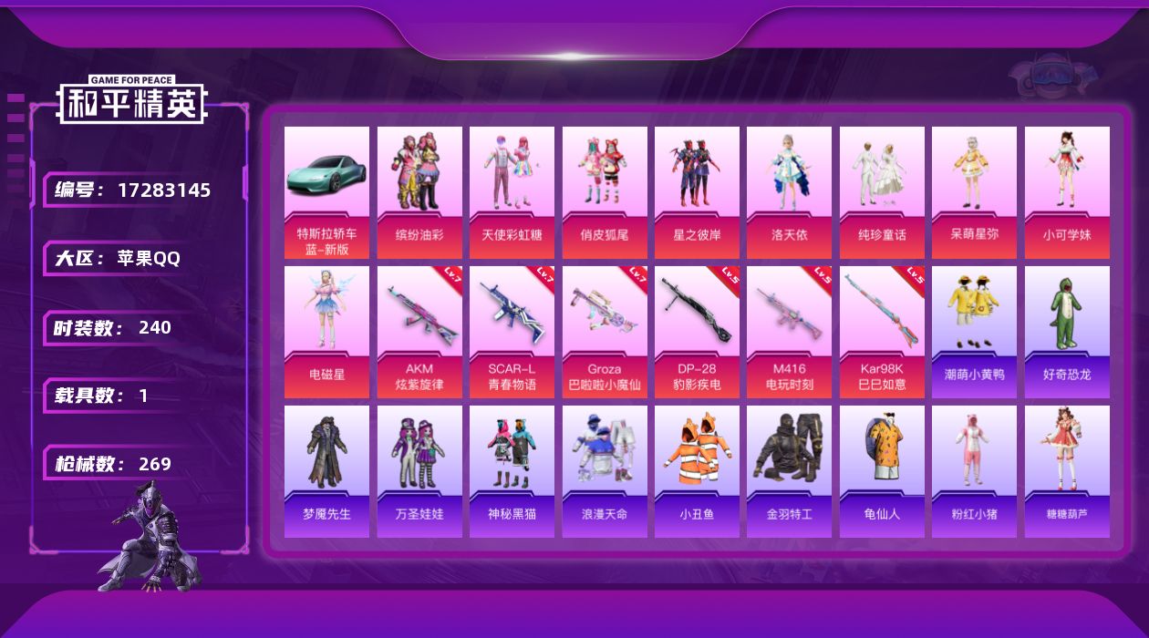 [17283145]苹果 手Q-9粉装-7特效枪-1载具-1粉色飞行器-86827热力值-16王牌印记-240套装-269枪皮
