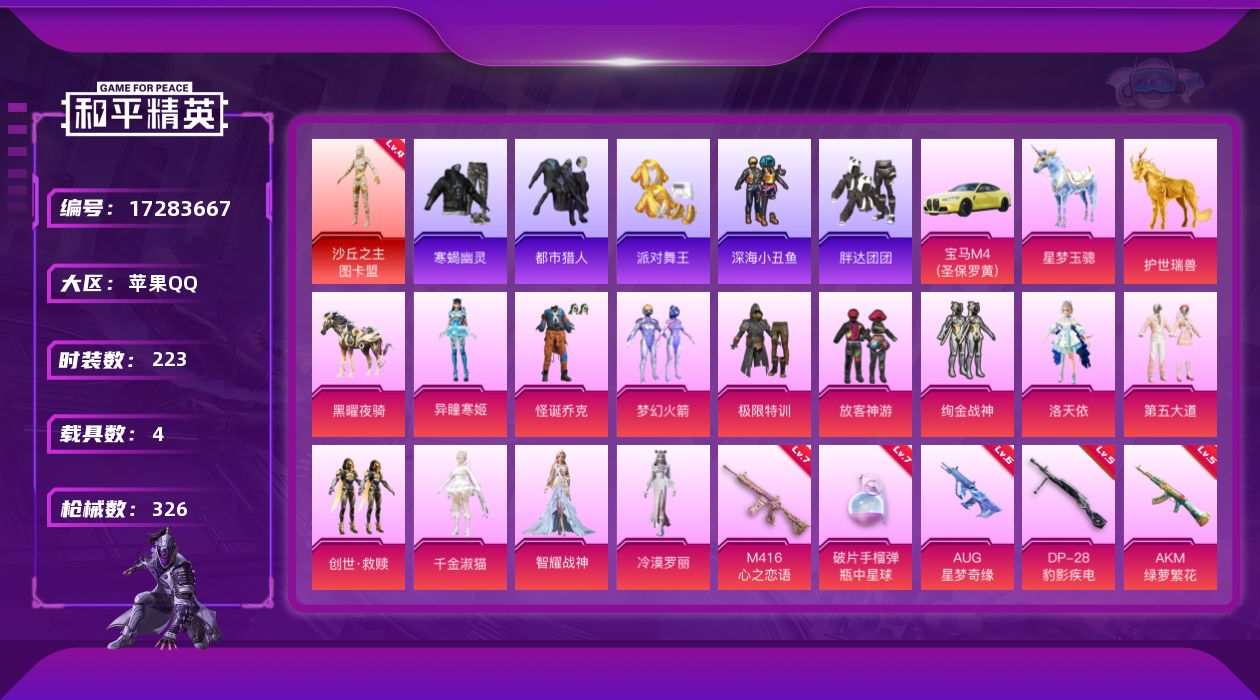 [17283667]苹果 手Q-1神装-13粉装-20特效枪-4载具-16粉色飞行器-112041热力值-17王牌印记-223套装-326枪皮