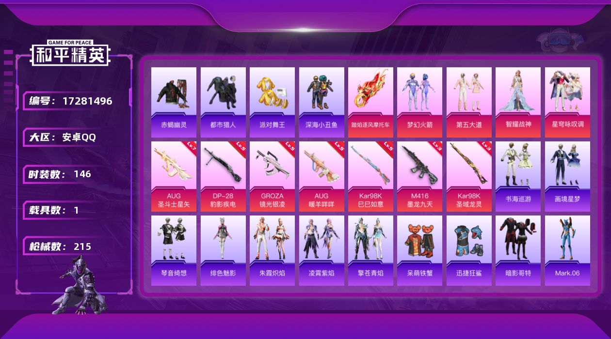 [17281496]安卓 手Q-4粉装-9特效枪-1载具-9粉色飞行器-66759热力值-2王牌印记-146套装-215枪皮