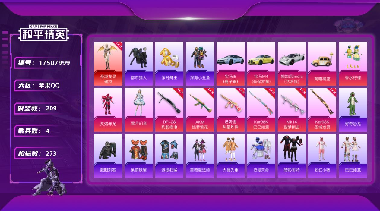 [17507999]【特价出售/店主推荐】 苹果 手Q-1神装-3粉装-7特效枪-4载具-3粉色飞行器-84778热力值-11王牌印记-209套装-273枪皮 【红色神装等级】:圣域龙灵-瑞拉(二级) 【红色角色神装】:圣域龙灵-瑞拉 【热门品类】:套装-浪漫天命,套装-都市猎人,套装-派对舞王,套装-深海小丑鱼,旭日初心兜帽大衣,套装-暗影哥特,套装-粉红小猪 【粉色套装】:粉装-香水柠檬,粉装-炙焰赤龙,粉装-雪月幻音 【粉色枪皮等级】:AKM-绿萝繁花(五级),汤姆逊-热量炸弹(五级),Kar98K-巳巳如意(五级),Kar98K-圣域龙灵(三级),Mk14-甜梦熊击(五级),DP-28-豹影疾电(五级),PKM-萌骑夺宝(二级) 【粉色载具】:宝马i8(离子银),宝马M4(圣保罗黄),帕加尼imola(艺术银),萌喵橘座 【粉色枪皮】:AKM-绿萝繁花,汤姆逊-热量炸弹,Kar98K-巳巳如意,Kar98K-圣域龙灵,Mk14-甜梦熊击,DP-28-豹影疾电,PKM-萌骑夺宝 【粉色飞行器】:沙丘之主天马,万象金身飞行器,圣域金龙飞行器 【粉色降落伞】:深海曼妙降落伞,PEL轰鸣竞梦者降落伞,银刃赛罗降落伞,暗夜玫瑰降落伞,蓝莓炮弹降落伞,鬼刀降落伞,赛博古神降落伞,圣域龙灵降落伞,智耀战神降落伞,圣斗士星矢降落伞,星穹咏叹调降落伞,辉云木星降落伞 【稀有套装】:套装-巳巳如意,套装-新风雅兰,套装-紫幽梦,套装-蓝冰羽,角色-瑰梦爱神,套装-云朵鹅,套装-雪绒豹,角色-灵公主,套装-雨过天青,套装-红釉青花 【稀有枪皮】:AKM-夜灯,AKM-彩虹符号,AKM-影袭,AKM-灼热熔岩,AKM-玉龙,AKM-生命誓言,AKM-破晓战魂,AKM-缤纷海域,AKM-萌趣颜团子,AKM-虎虎生威,AKM-霓虹街区,AKM-龙的传人,M16A4-凝视深渊,M16A4-幻世战舞者,M16A4-红色方程式,M16A4-蓝色火焰,SCAR-L-夜灯,SCAR-L-炫彩节奏,SCAR-L-生命誓言,SCAR-L-红色方程式,M416-仓鼠灰灰,M416-夜灯,M416-暗夜行者,M416-红色方程式,M416-绯红前夜,M416-蓝色火焰,M416-黄金狮王,GROZA-彩虹符号,GROZA-影袭,GROZA-治愈之星,GROZA-生命誓言,GROZA-田园牧歌,GROZA-黑色刀锋,AUG