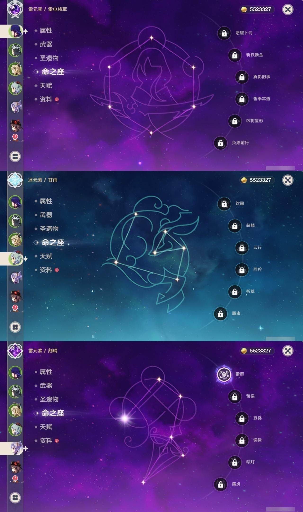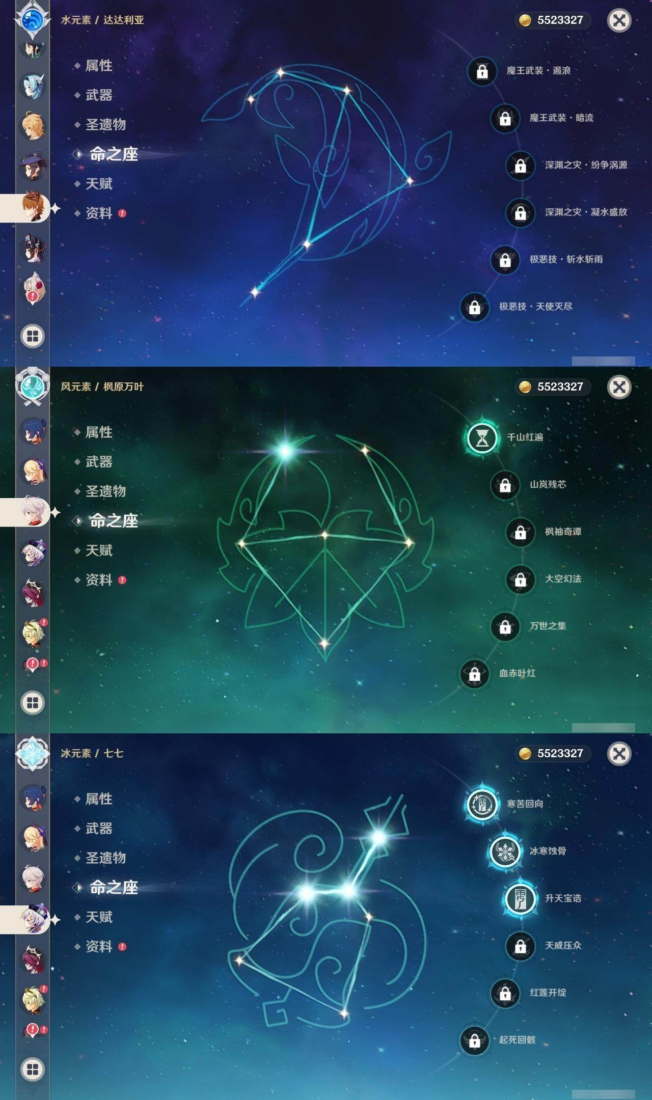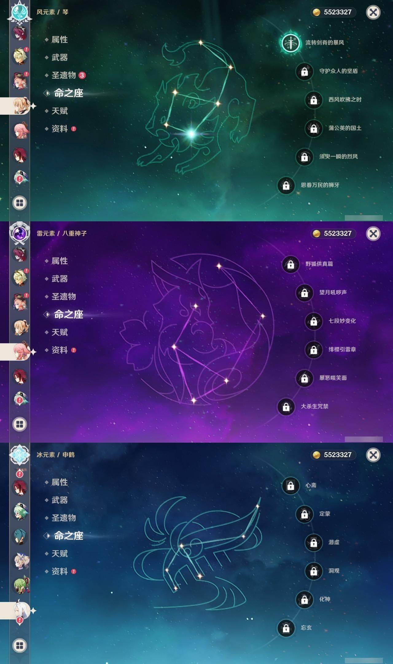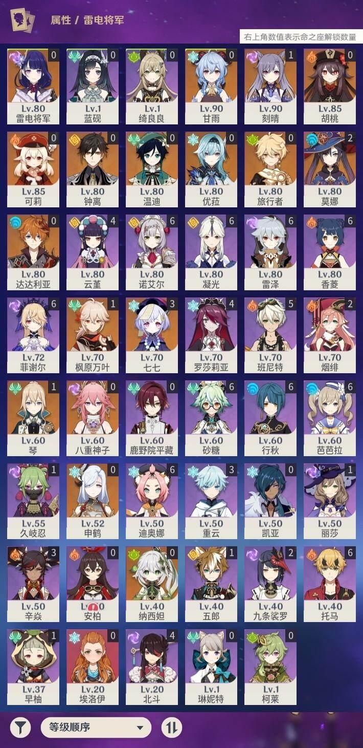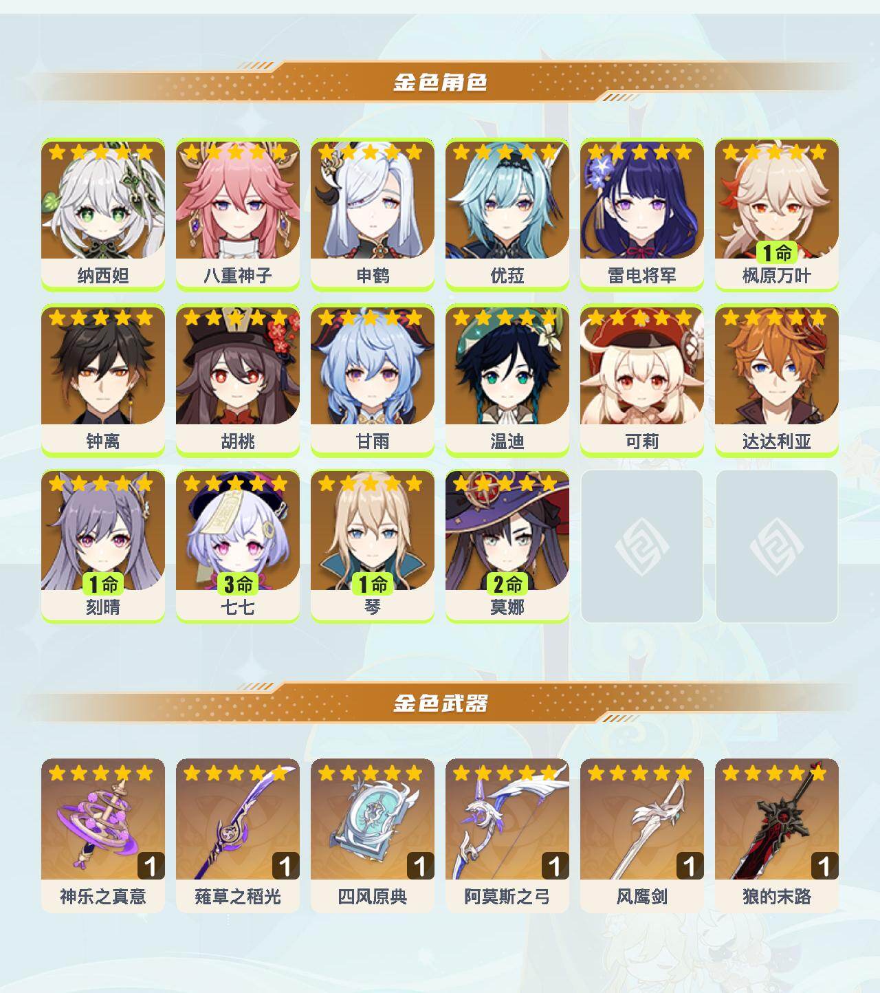 0命纳西妲,0命八重神子,0命申鹤,0命优菈,0命雷电将军,1命枫原万叶,0命钟离,0命胡桃,0命甘雨,0命温迪,0命可莉,0命达达利亚,1命刻晴,3命七七,1命琴,2命莫娜,精1神乐之真意,精1薙草之稻光,精1四风原典,精1阿莫斯之弓,精1风鹰剑,精1狼的末路
