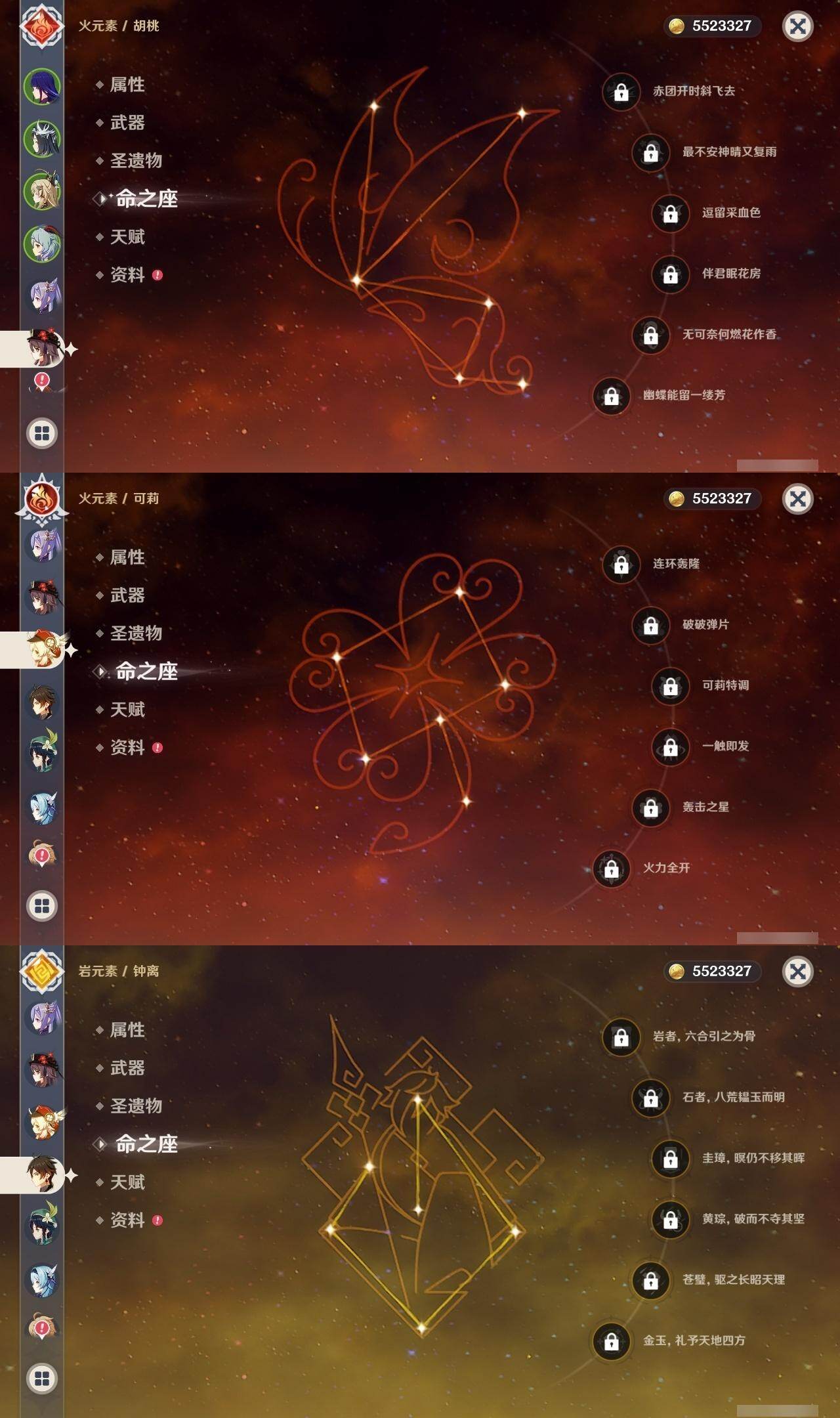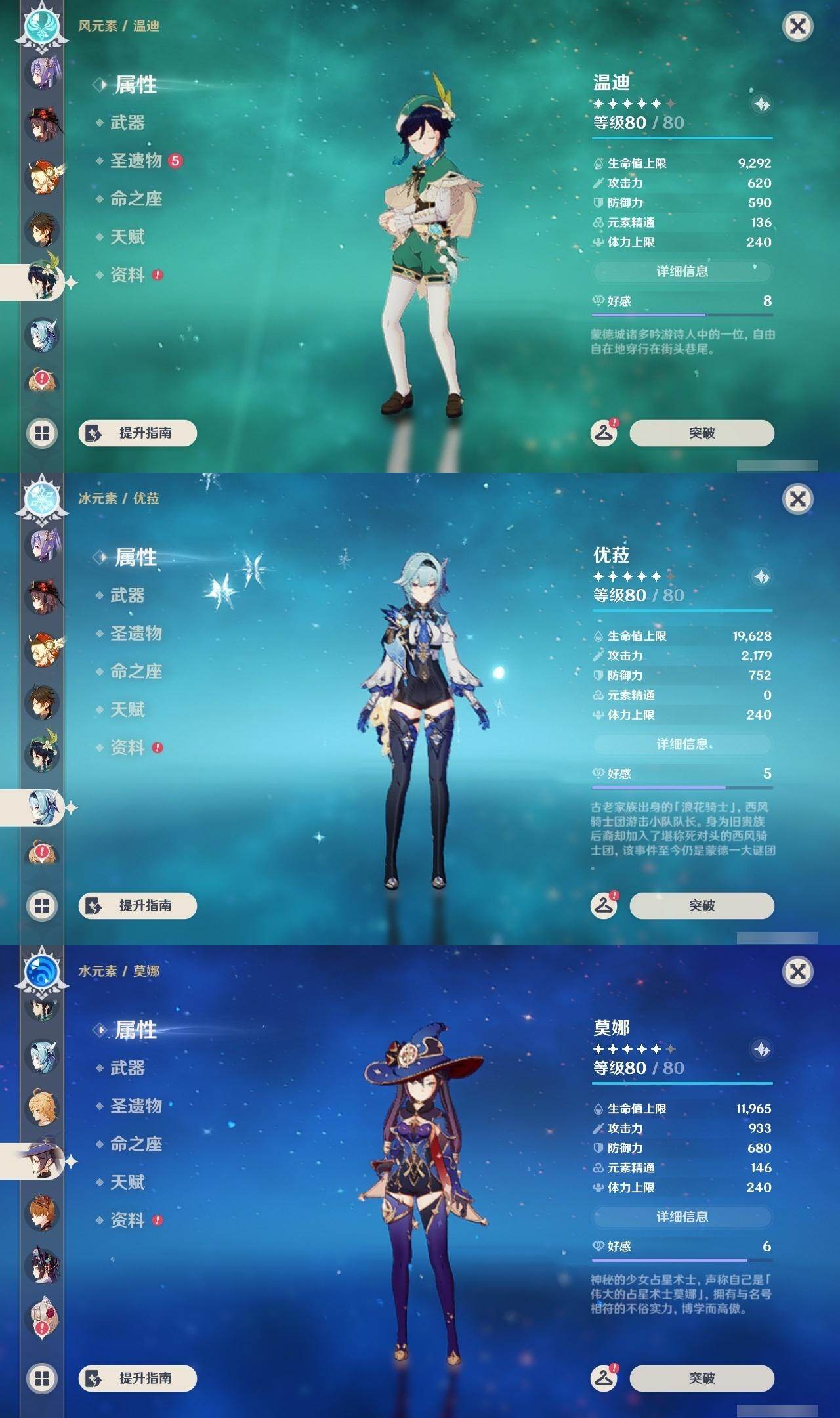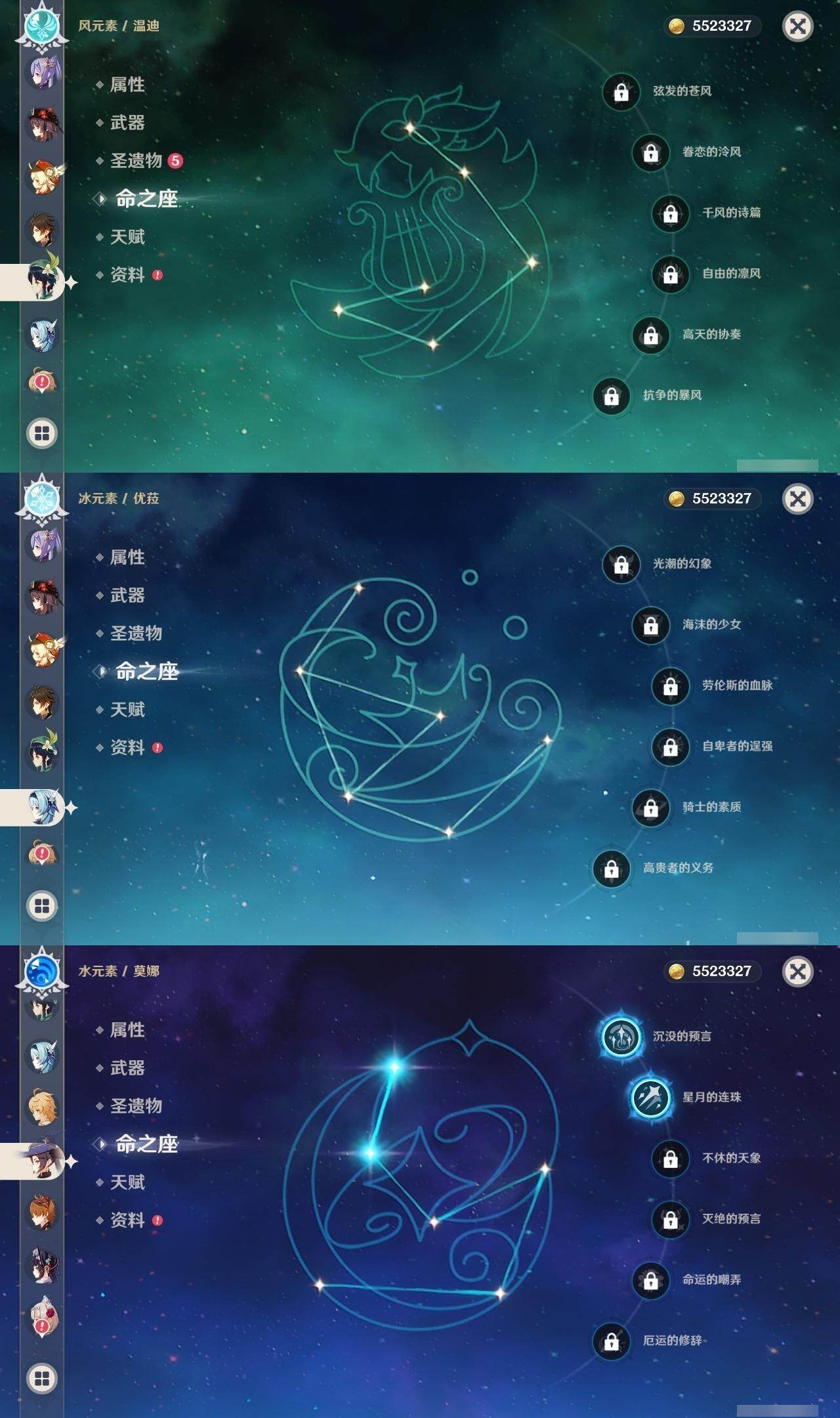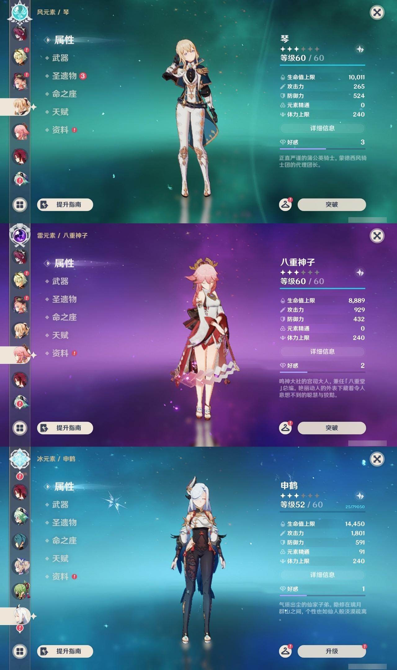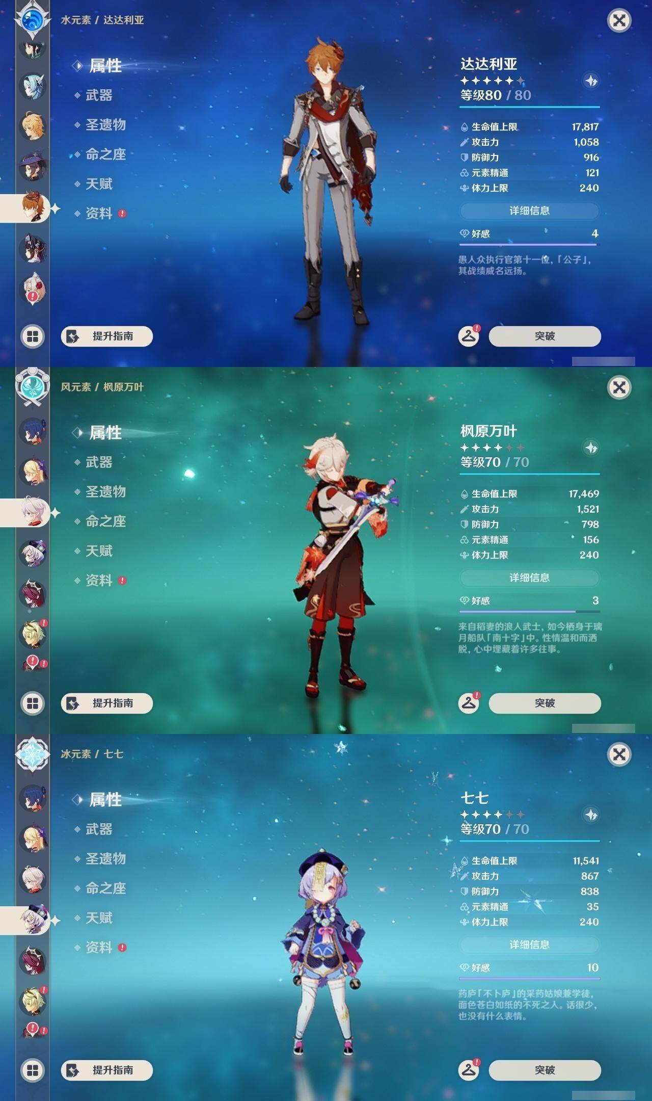 0命纳西妲,0命八重神子,0命申鹤,0命优菈,0命雷电将军,1命枫原万叶,0命钟离,0命胡桃,0命甘雨,0命温迪,0命可莉,0命达达利亚,1命刻晴,3命七七,1命琴,2命莫娜,精1神乐之真意,精1薙草之稻光,精1四风原典,精1阿莫斯之弓,精1风鹰剑,精1狼的末路