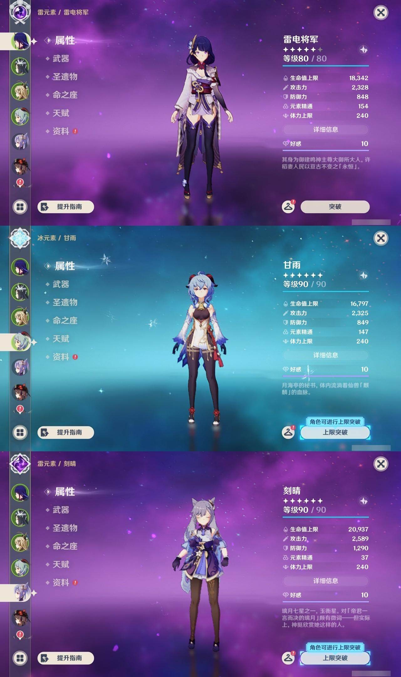雷电将军,甘雨,刻晴,胡桃,可莉,钟离,温迪,优菈,莫娜,达达利亚,枫原万叶,七七,琴,八重神子,申鹤