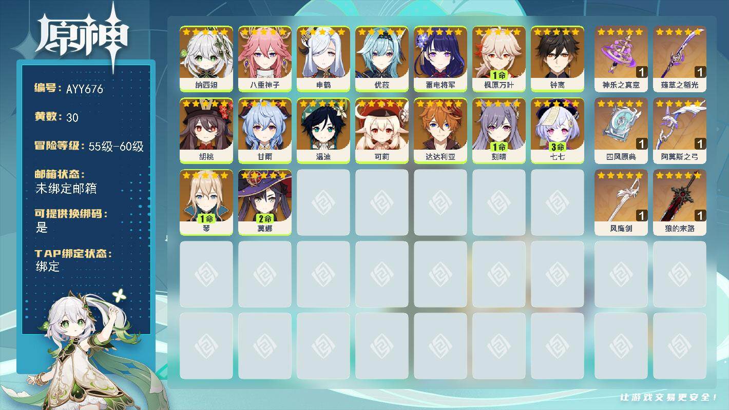 [17508043]57级/30黄/男主/16个五星角色/6个五星武器 0命纳西妲,0命八重神子,0命申鹤,0命优菈,0命雷电将军,1命枫原万叶,0命钟离,0命胡桃,0命甘雨,0命温迪,0命可莉,0命达达利亚,1命刻晴,3命七七,1命琴,2命莫娜,精1神乐之真意,精1薙草之稻光,精1四风原典,精1阿莫斯之弓,精1风鹰剑,精1狼的末路