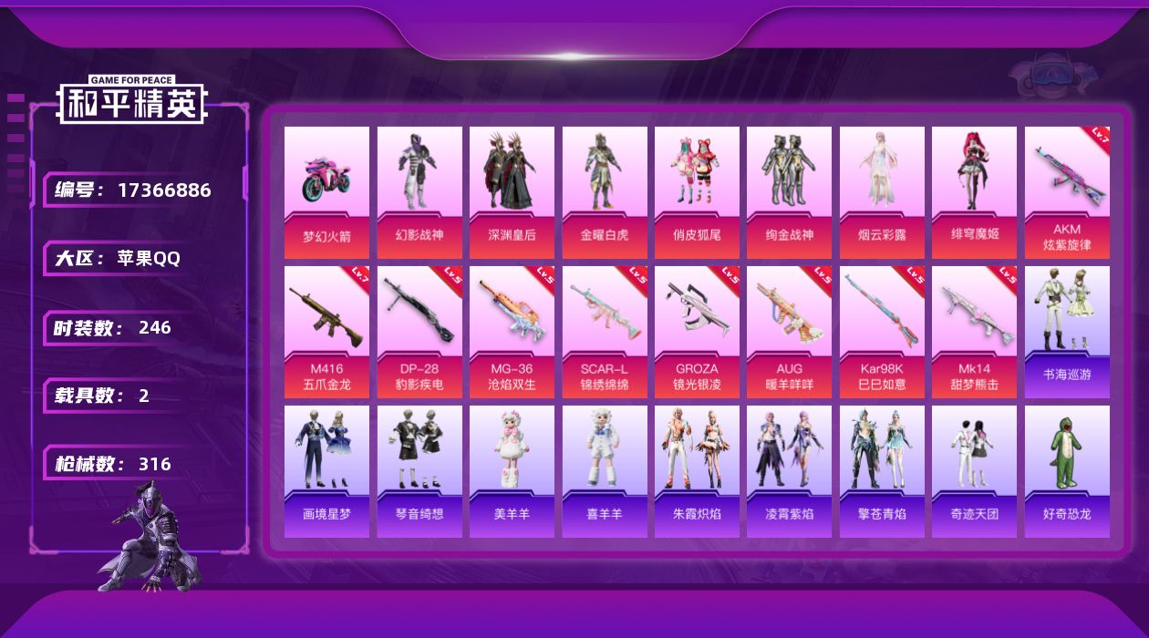 [17366886]苹果 手Q-7粉装-14特效枪-2载具-2粉色飞行器-98451热力值-16王牌印记-246套装-316枪皮